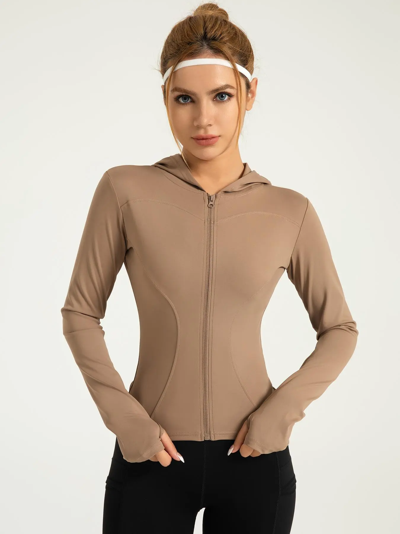 5. Women's Solid Zip Up Hooded, Sporty Long Sleeve Thumb Hole Outerwear for Yoga Gym Workout, Ladies Sportswear for All Seasons Yoga Jacket Top