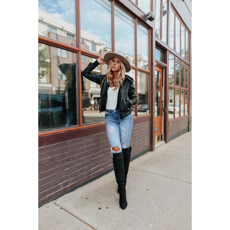 Round out your edgy wardrobe with the perfect sweatshirt/leather jacket combo! The Hooded Sweatshirt Vegan Leather Black Jacket features a drawstring hoodie and zip-up sweatshirt trim lining the zipper and sleeve cuffs. Some other key features we love: the drawstring hood, zipper pockets, and the ribbed contrast hem!