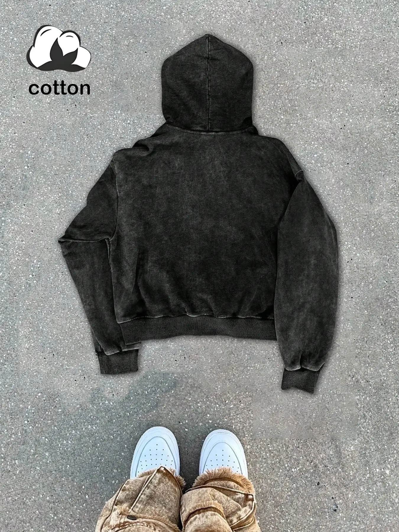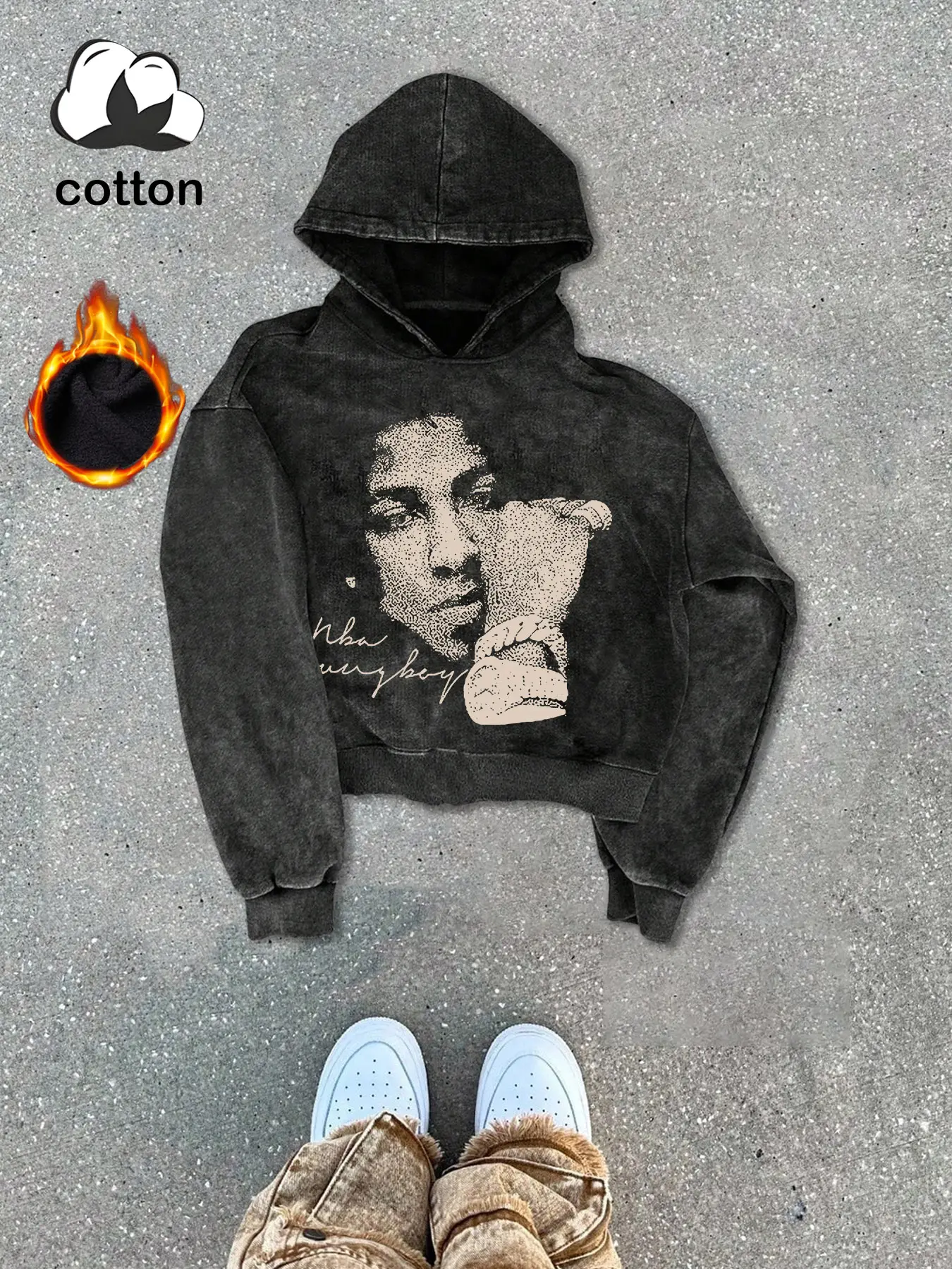Hoodie was cotton material not the lint type that gets the little lint balls on. It was a little thin. The picture on it is OK doesn’t really look as much like him in person.