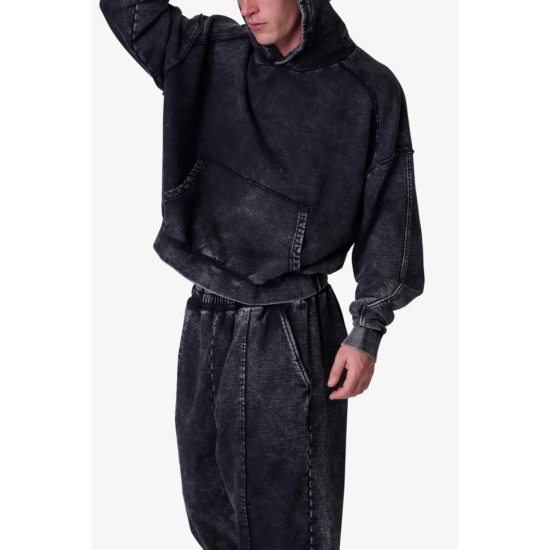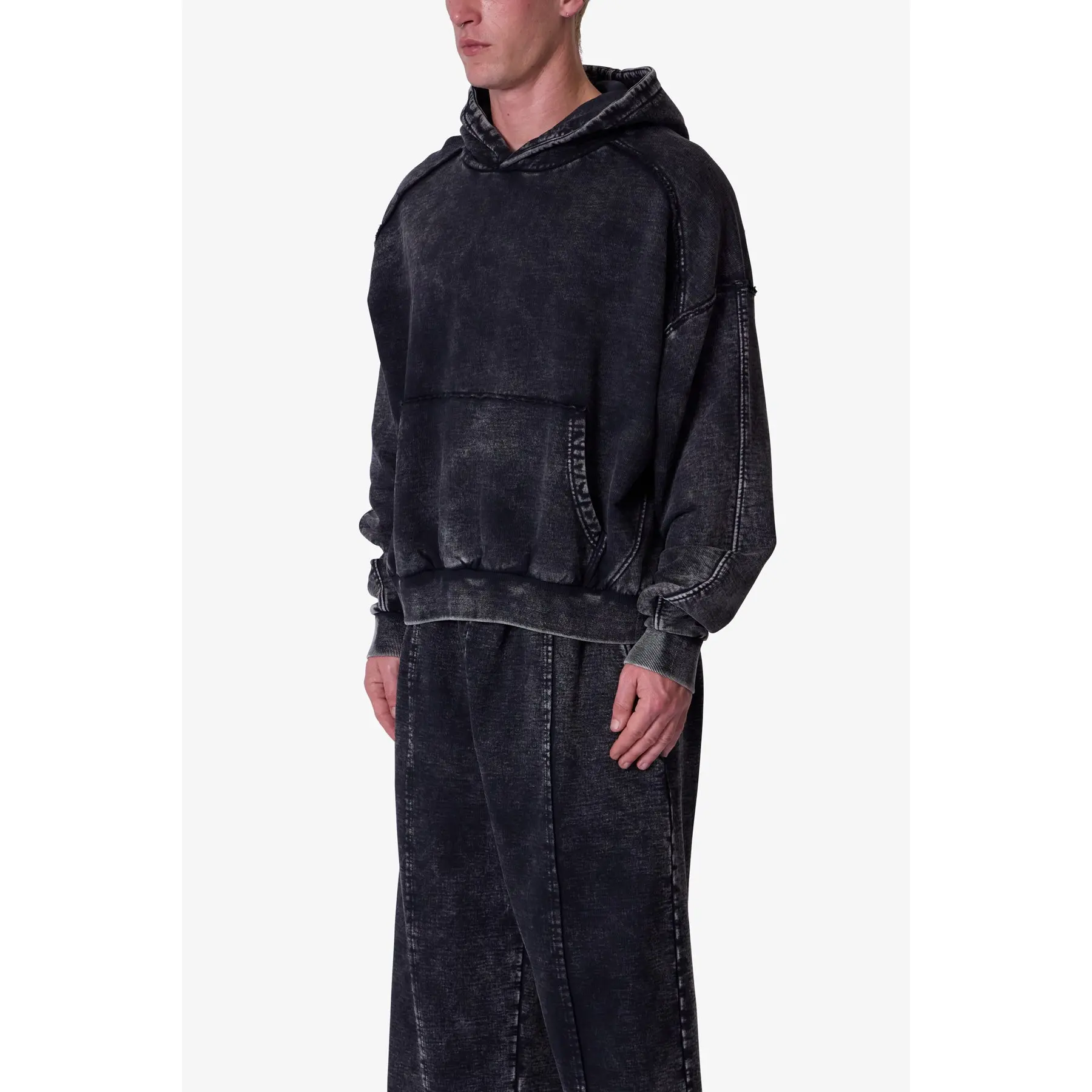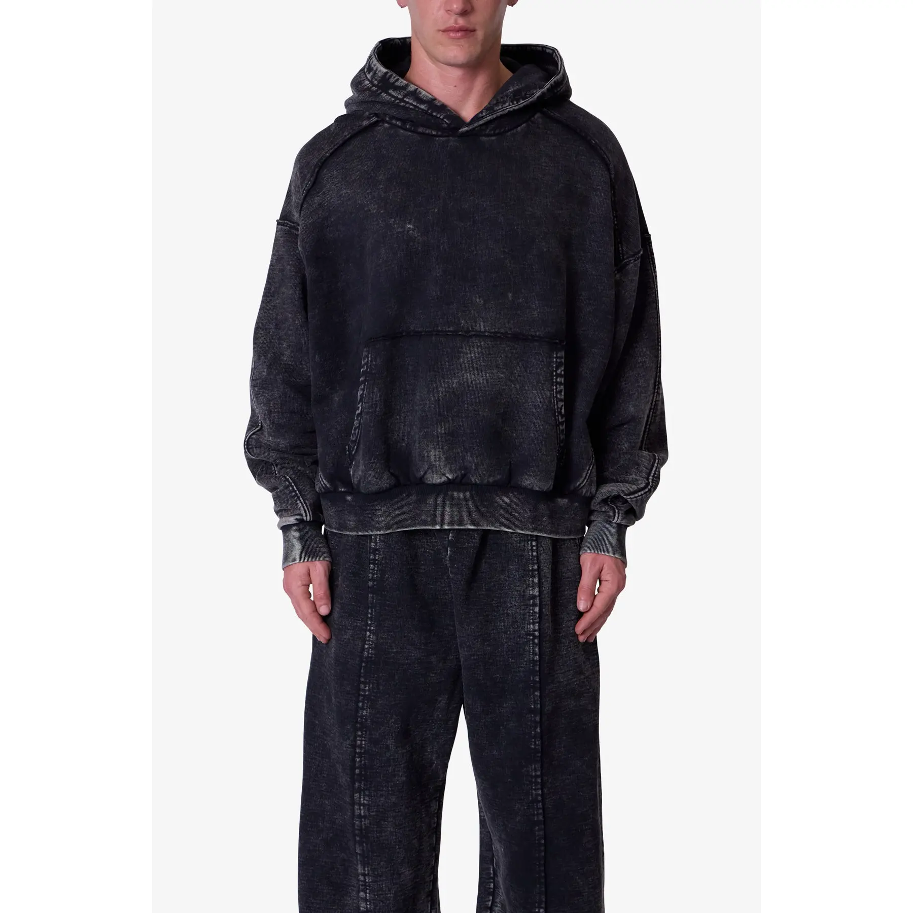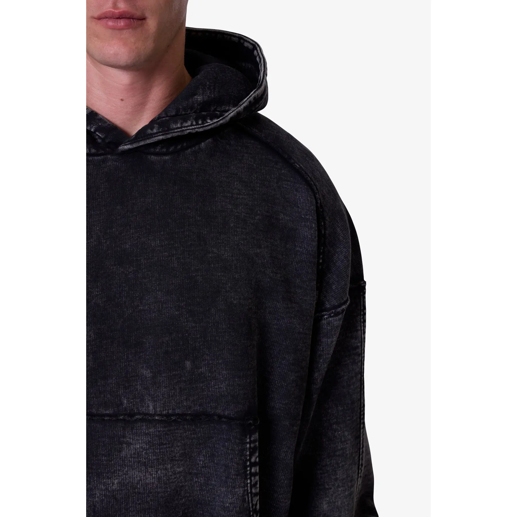 the Frayed Seam Acid Wash Hoodie features a relaxed fit with a dropped shoulder design, front pouch pocket, ribbing at the wrists and waist, exposed seam details throughout, and finished in both an acid washed and brushed fleece fabric.