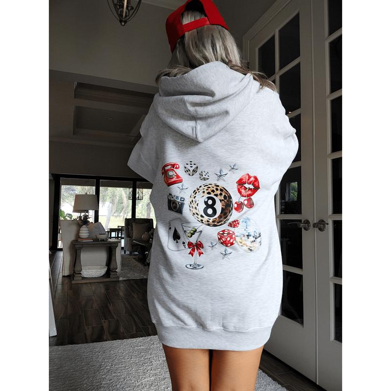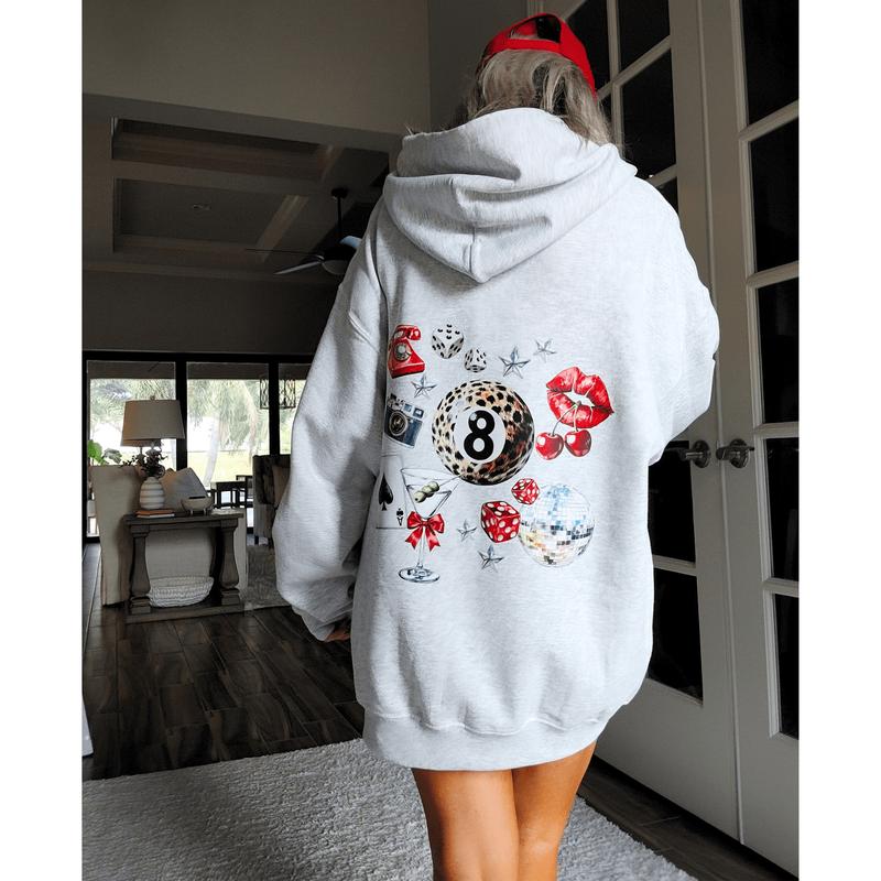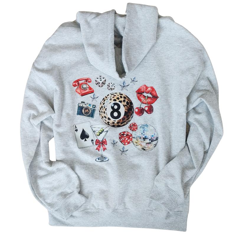 Unleash your inner luck and style with our Leopard 8 Ball Lucky Collage Hoodie. This trendy hoodie features a unique design of animal print, lucky symbols, and y2k style elements like dice, cherries, and disco balls. Perfect for a preppy aesthetic look, size up for an oversized fit.