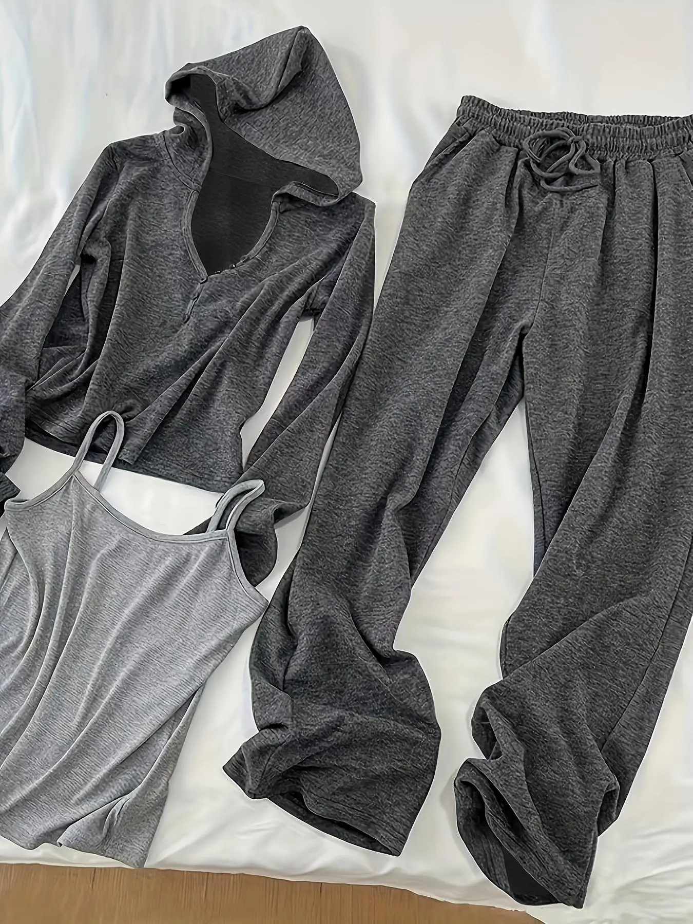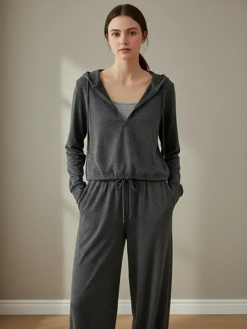 This is horrible. I am 5’6, 140lbs and ordered a LG bc I wanted something roomy and comfortable. The pants are huge and the drawstring is a fake sewed on string in front so you can’t make them tighter. The hoodie is SMALL and the buttons on the front are fake so you can’t undo them and it just looks like you’re popping out. I am a B cup and I look ridiculous. The tank top is sewn together crooked as you can see on my tattoos, which I assure you are quite symmetrical. I would NEVER purchase from this company again and totally wasted $20.