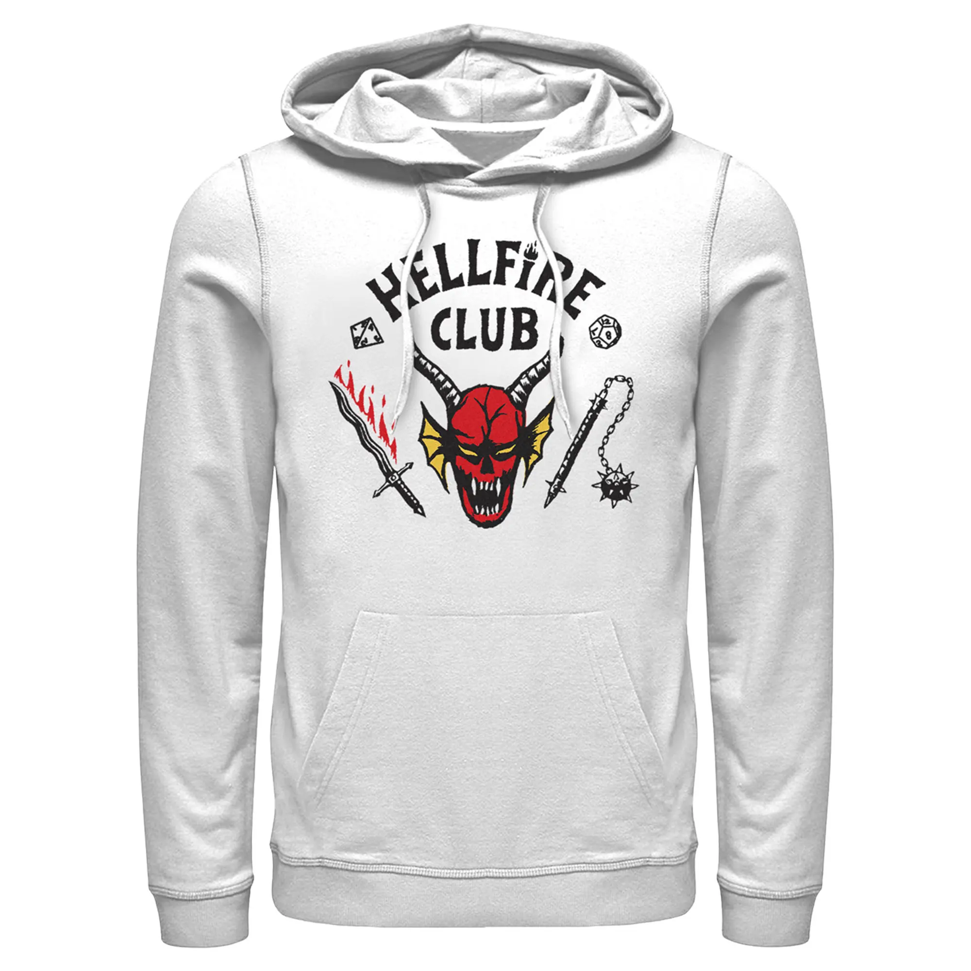 Turn your world upside down with this officially licensed Stranger Things Season 4 Men's Graphic Hoodie! Your favorite 1980s-inspired Netflix television series is taking you back to Hawkins, Indiana to fight the evil creature, Vecna, who is terrorizing Max and other traumatized members of the town! Blast your favorite song and wear this awesome sweatshirt to fight the curse of Vecna today. This men's sweatshirt features the iconic Hellfire Club logo with a flaming sword, a morning star, and dice!