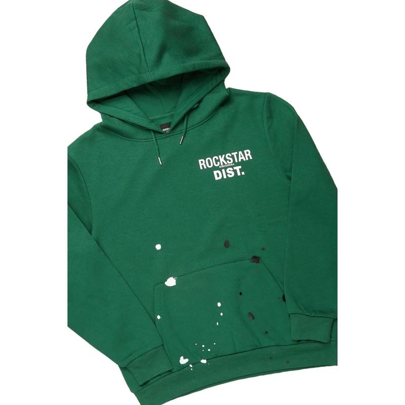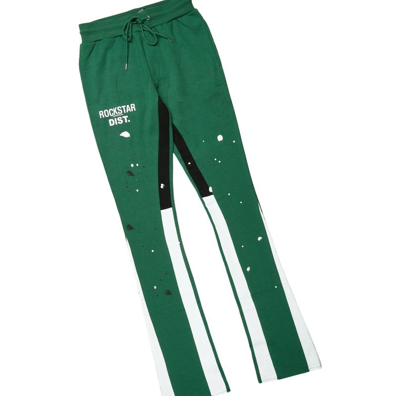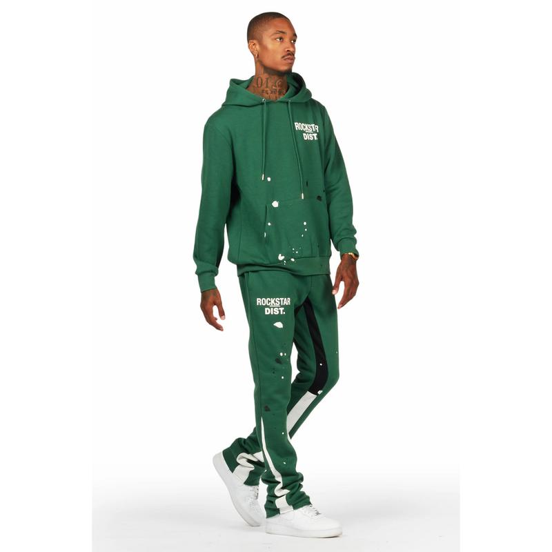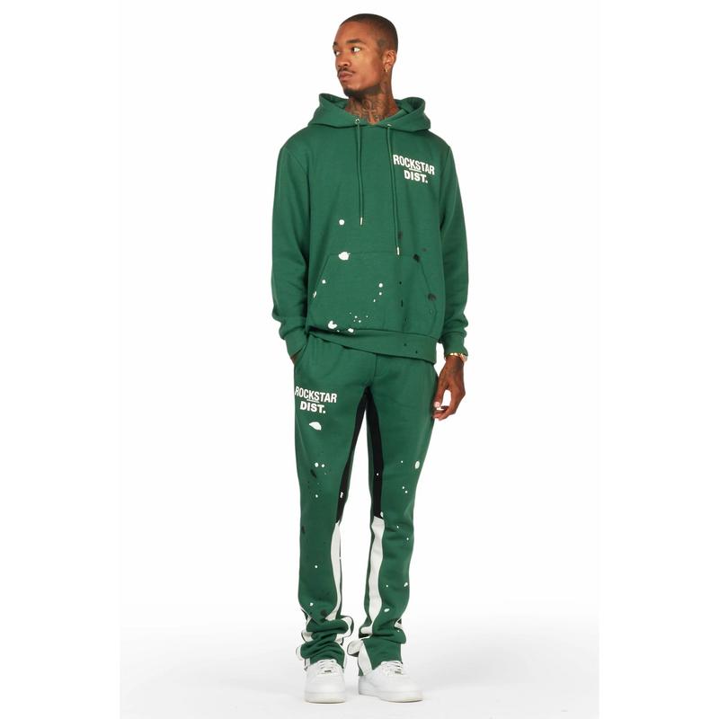 An urban two-piece stack flare track set for men in green. Designed with extra long legs and custom paint splatter detailing for a dope streetwear set.