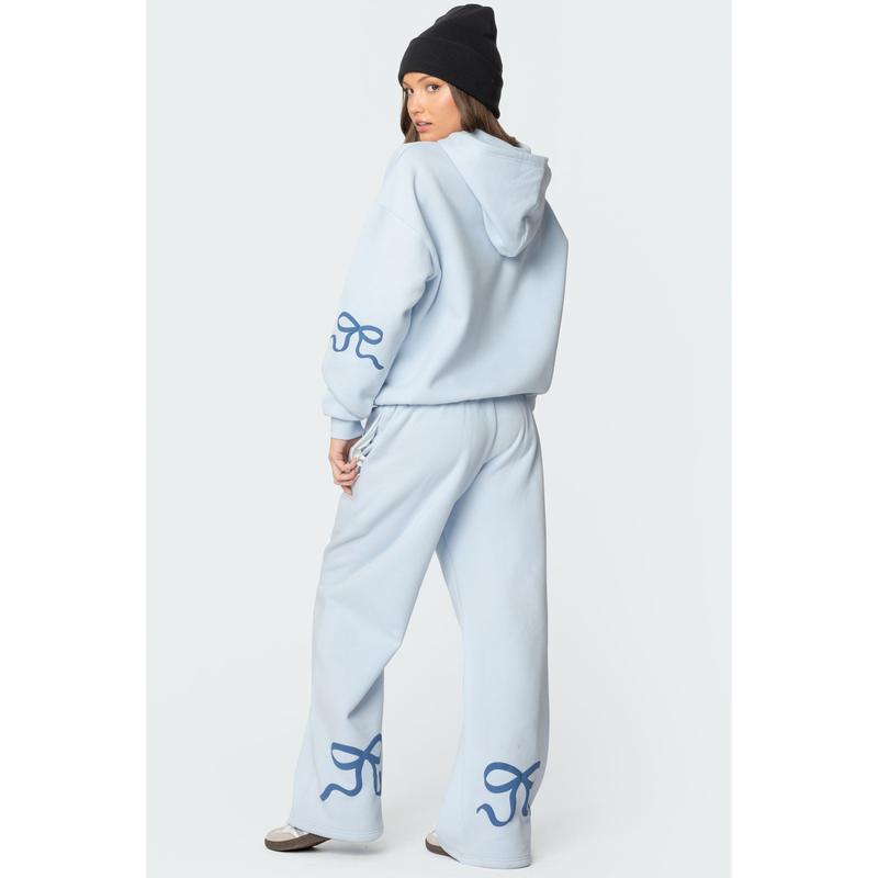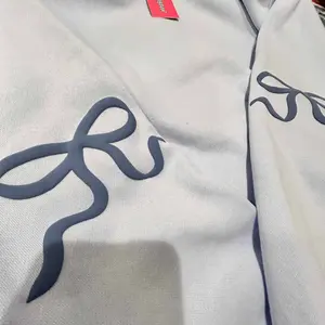 i love the bow detail it has that 3d puffy touch to it. it’s very soft and true to size i wish i gotten a large so it could be a little oversized but overall great product