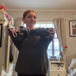 I love this hoodie so much and I love how itās basic but has little bow designs. itās really high-quality and super comfortable and for reference, Iām 5ā4 and small fits perfectly.