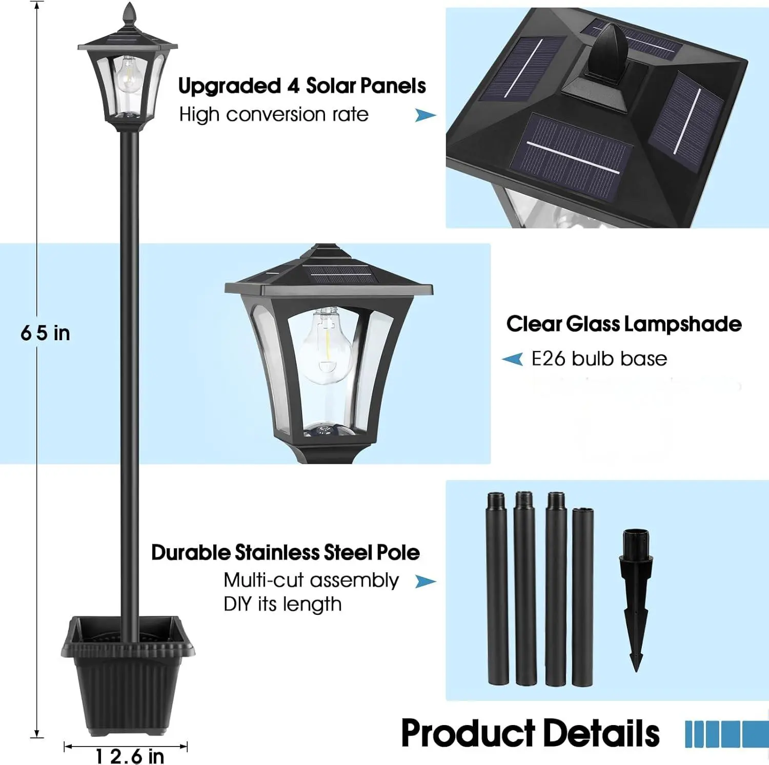 ·Crafted with a premium ABS shell and a high-transparency glass lampshade, the support pole is constructed with thickened aluminum and a rustproof finish.
