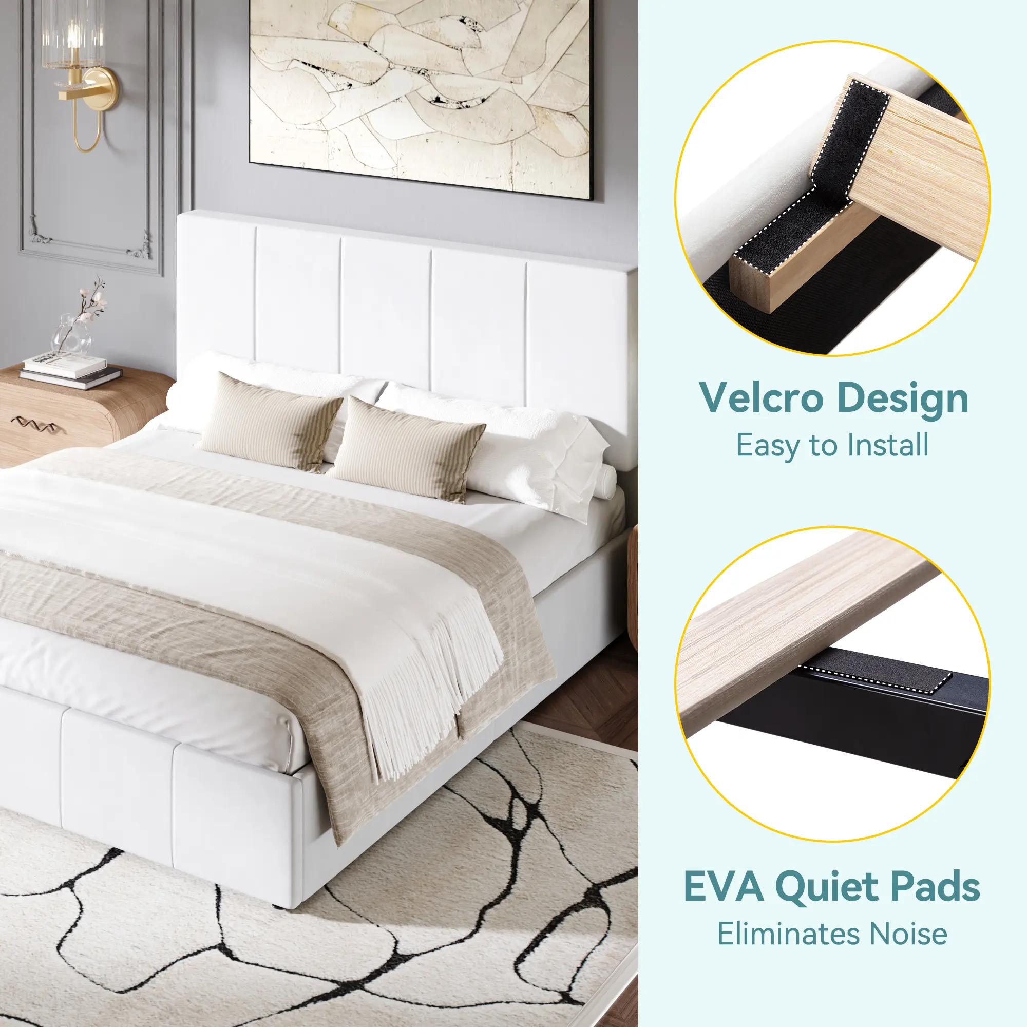 ·Robust 900 lb Support Structure: Built with durable velcro wooden slats and reinforced steel support bars, this bed frame reliably holds up to 900 lbs. An EVA mute bar on the center beam reduces friction noise, ensuring a quiet and restful sleep.