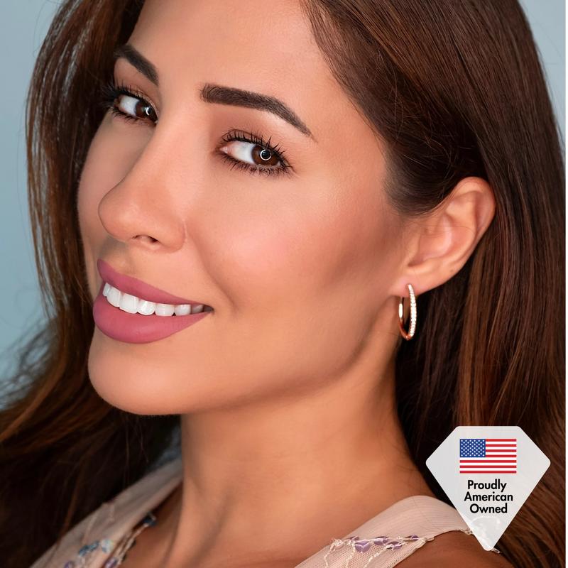 18k white gold plated 25 mm hoop earrings with 34 simulated diamond crystals for brilliant everyday sparkle. Lightweight, hypoallergenic, and crafted for sensitive ears with a secure latch-back closure. Perfect for gifting, daily wear, and adding a polished shine to any outfit.
