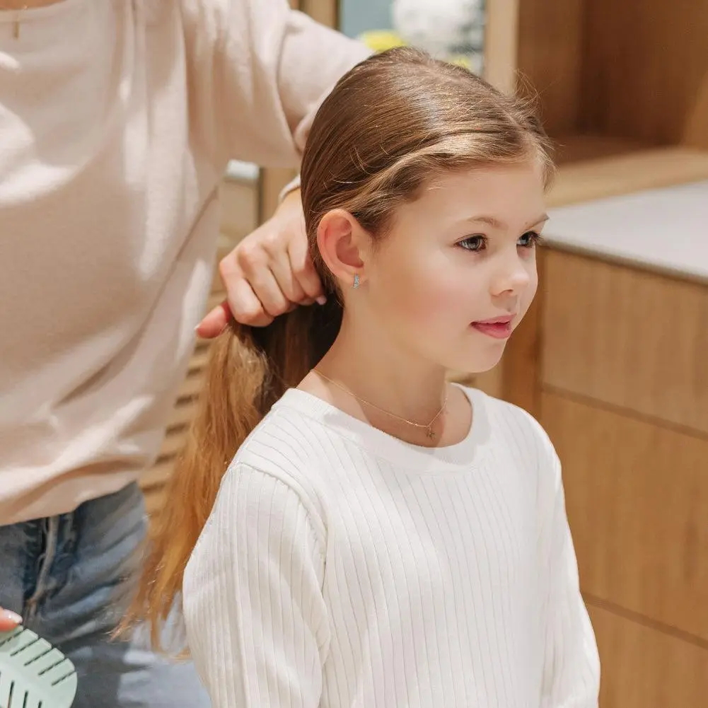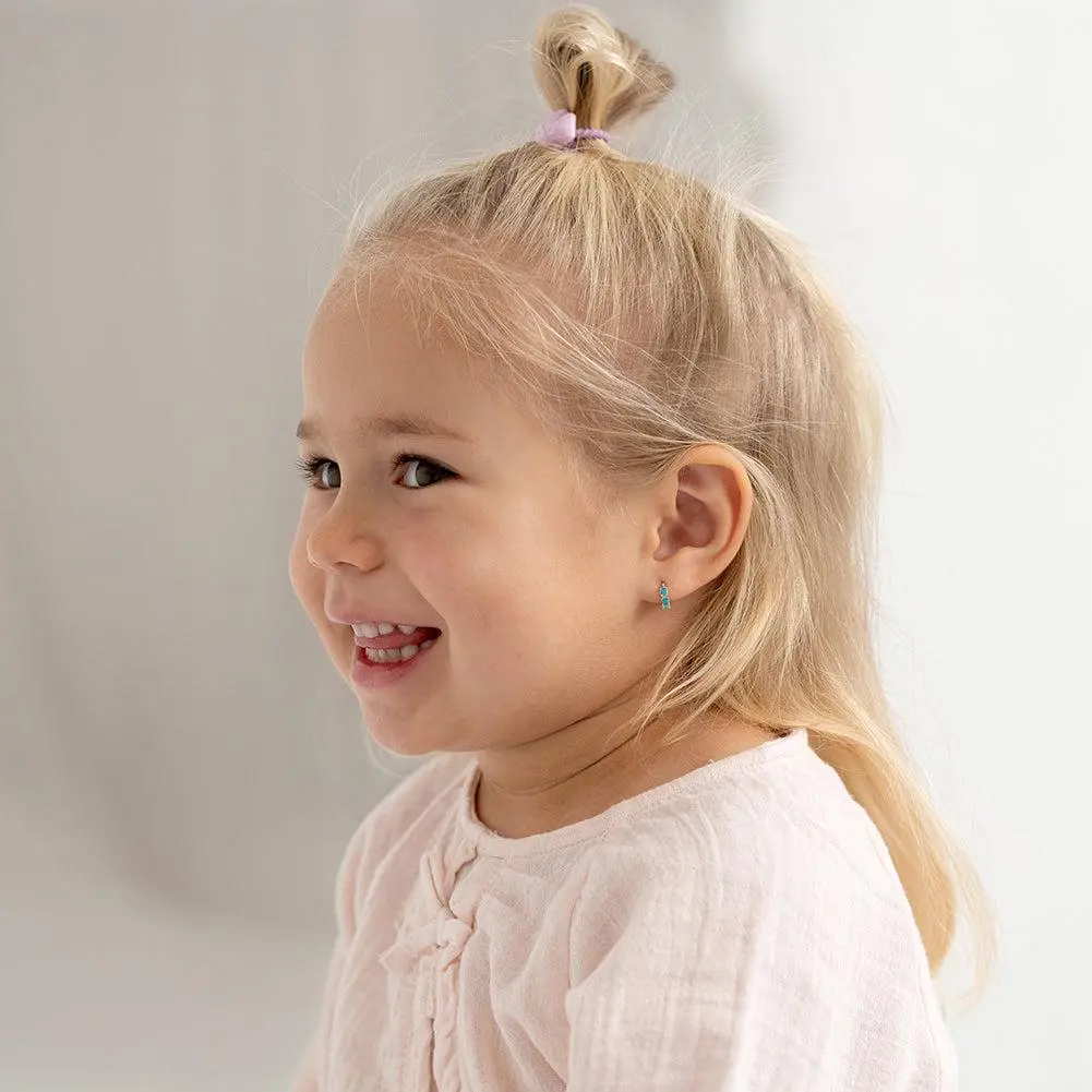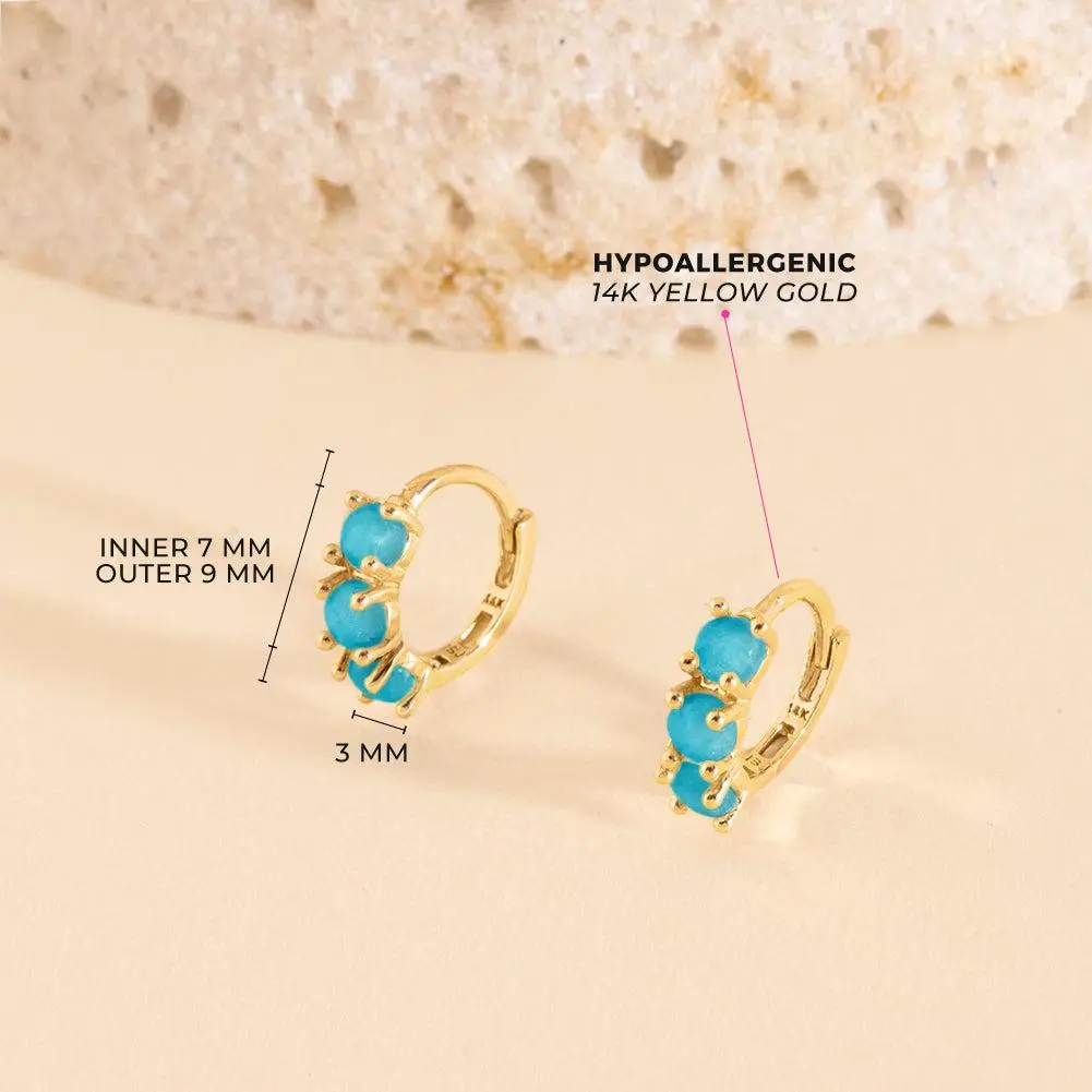 Enhance your little one's charm with these dainty hoop earrings crafted from 14k yellow gold, designed specifically for girls with sensitive skin. Measuring a delicate 7mm inner diameter, these earrings boast a timeless elegance. Adorning the front are three prong-set simulated turquoise stones, adding a touch of sparkle to any ensemble. For everyday wear or special occasions, these earrings effortlessly blend style and comfort, making them an ideal addition to any young girls jewelry collection. Gift box included with purchase.