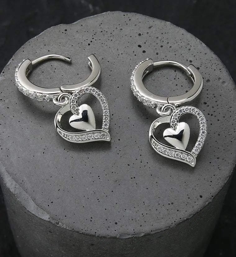 Hoop-style earrings with a dangling heart attached that is filled with clear cz gems and a smaller heart inside. Hinged clasp is made from 316L stainless steel and the heart design is made from brass. Size is 18G. Diameter is 3/8" (10mm). Total length is approximately 27mm. The hinged design is easy to open and close. Sold in pairs (2 pieces).