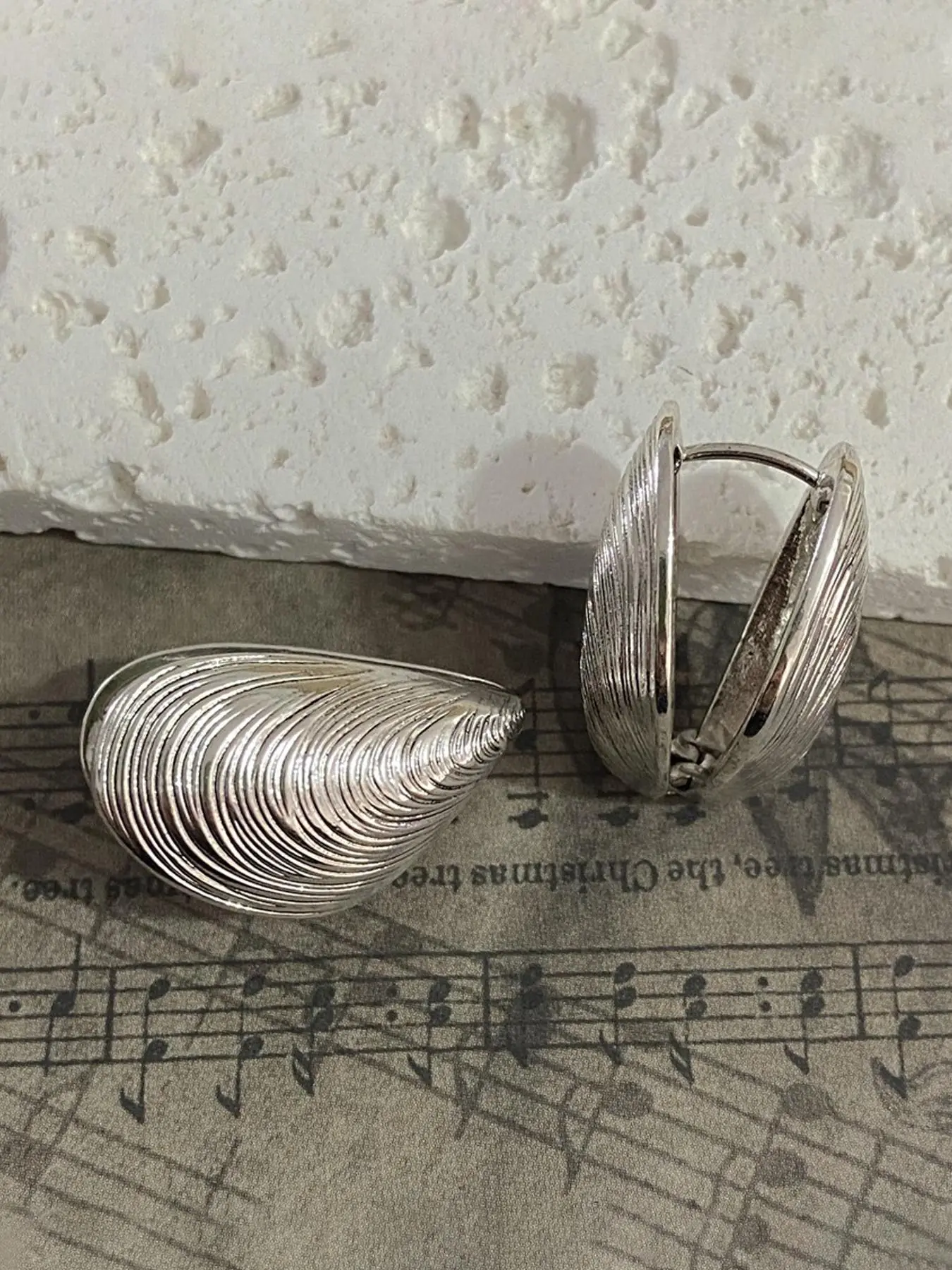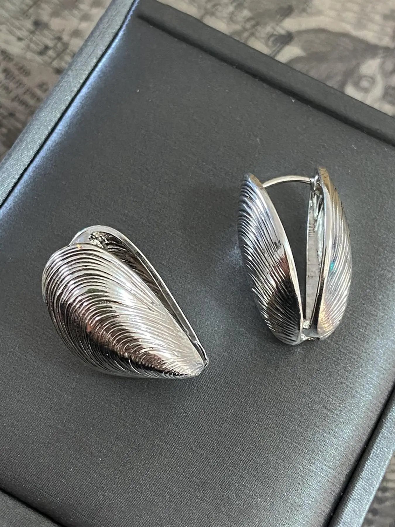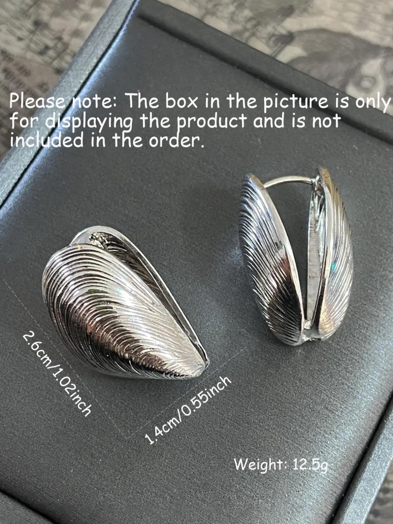 The pattern on the earrings themselves is different than the listed photo - it looks less like a muscle shell and more like a big thumb print. The clasp is also a little wonky - it doesn’t seem super duper secure. But for the price they are fine!