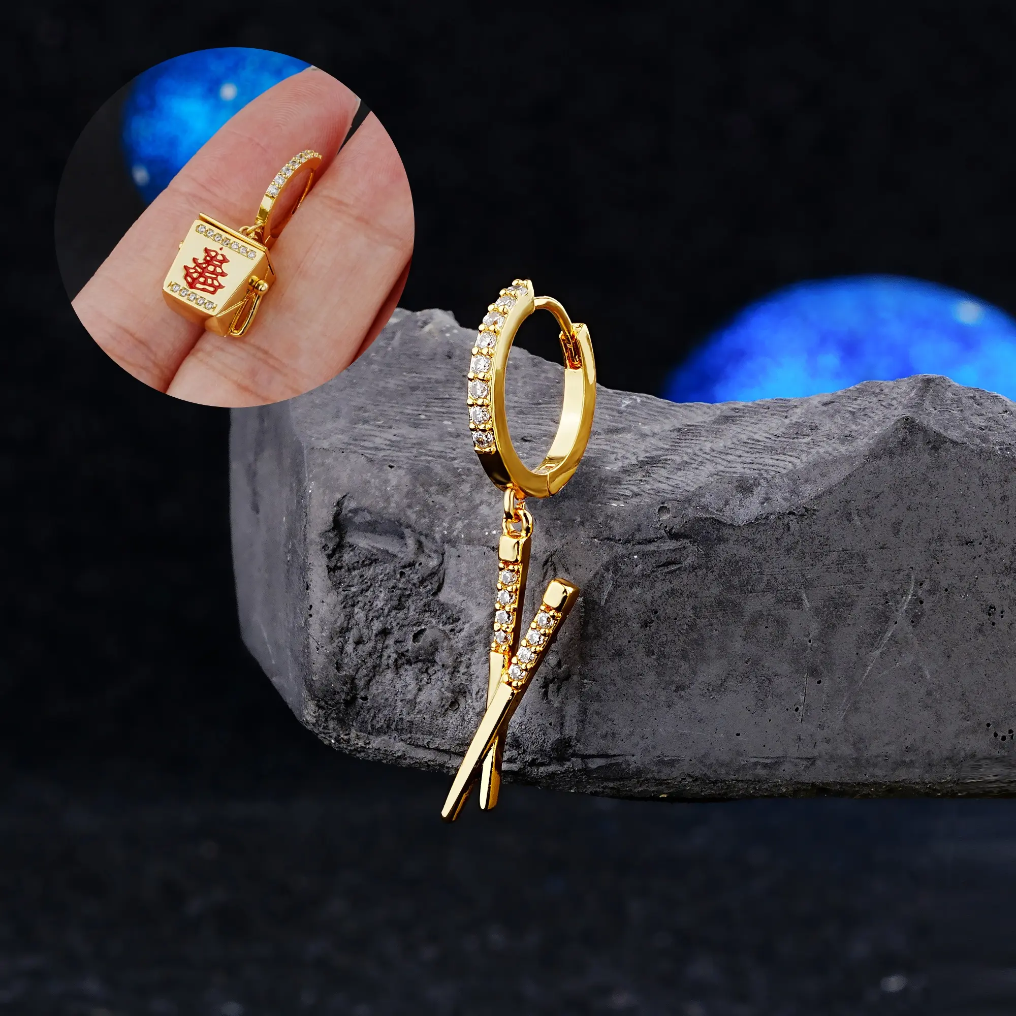 5. Oufer Chinese Take Out Container & Chopsticks 18K Plating Hoop Earrings - Brass Material, Chopsticks Design, 18K Plating, Elegant Earcuff Jewelry in Silver & Gold