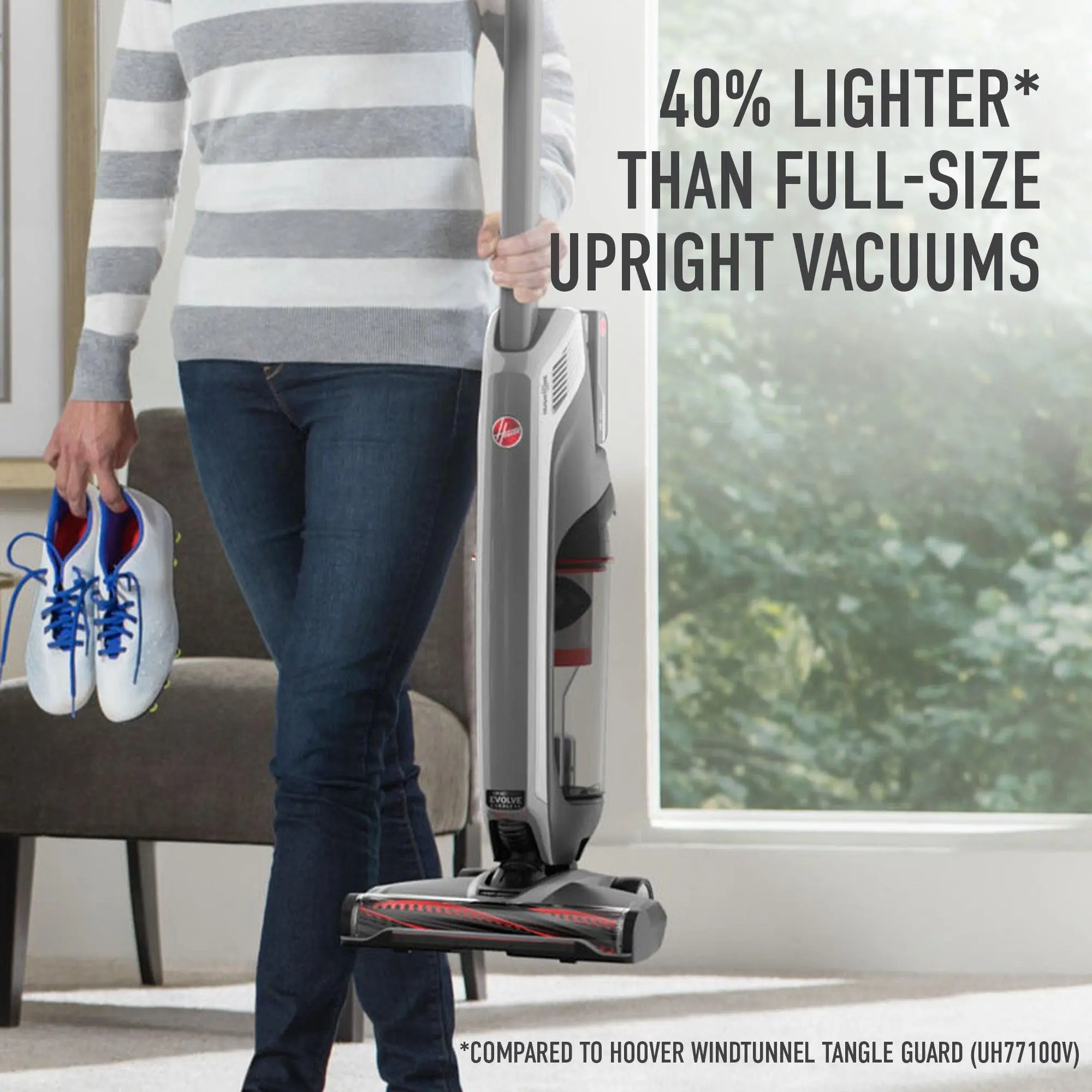 The Hoover ONEPWR Evolve Pet Elite provides superior suction across all floor types. A high-performance brushless motor paired with HushTone technology delivers 50% more suction power without compromising performance for a quiet, efficient clean. Cover hard floors and carpets cord-free with the ONEPWR™ 4Ah for over 35 minutes of runtime**. The ultra-lightweight design comes in under 10 lbs without sacrificing a powerful clean. Armed with the Tangle Guard™ brush roll, prevent hair wrap up to 9" and tackle those tough pet messes. Clean your filter less often with 15 Cyclone Technology that captures 99.9% of dirt and dust particles, making this the perfect solution for high traffic areas. The ONEPWR Evolve™ Pet Elite is free standing and equipped with an XL Dirt Cup, Four Modes of Power Control, and LED headlights so you can see everything in its path and never miss a beat.