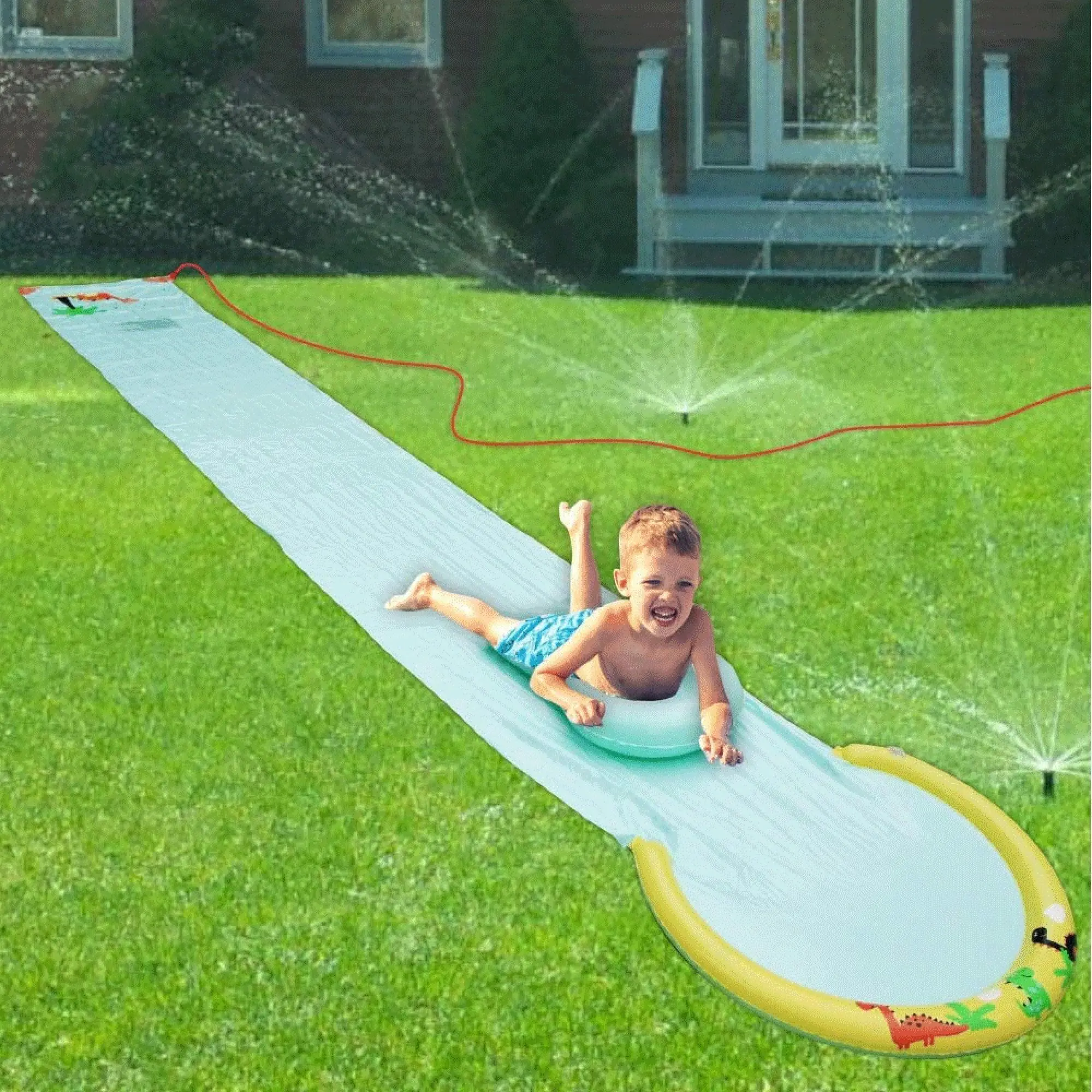 Minimal setup time by simply attaching a water hose at the end to connect a water source to the slide
