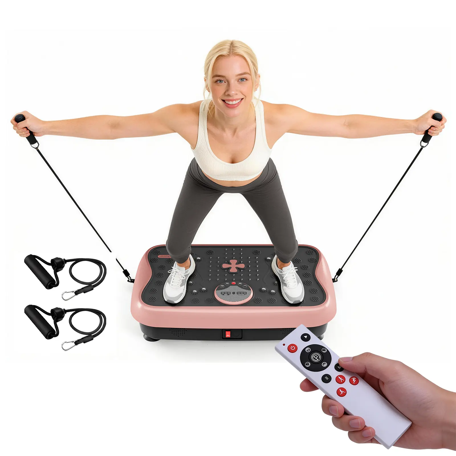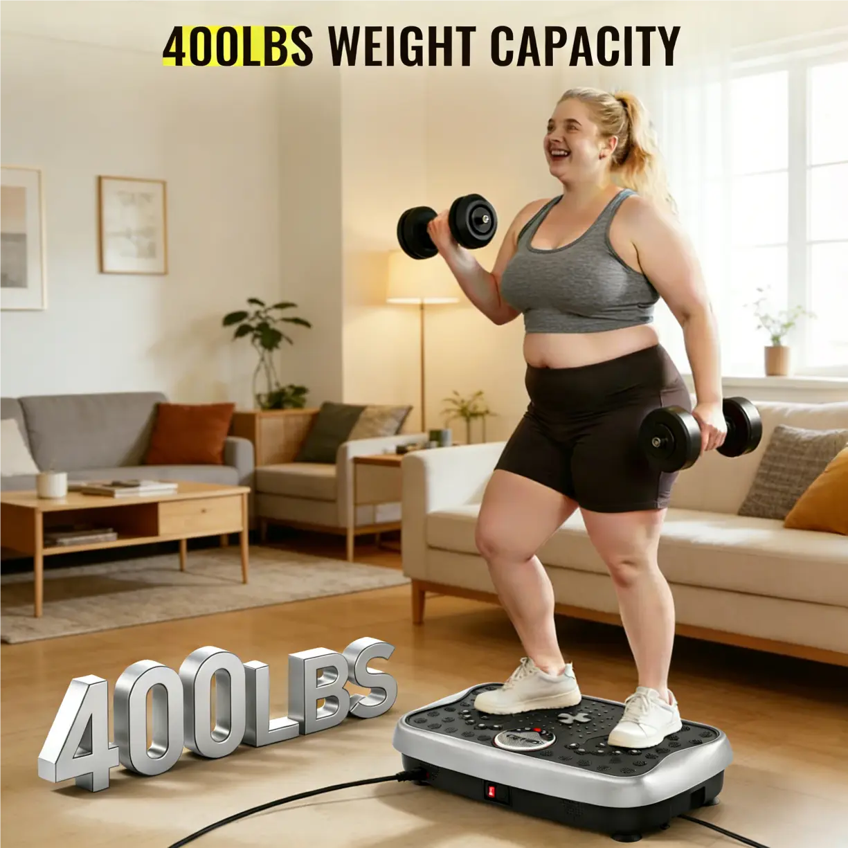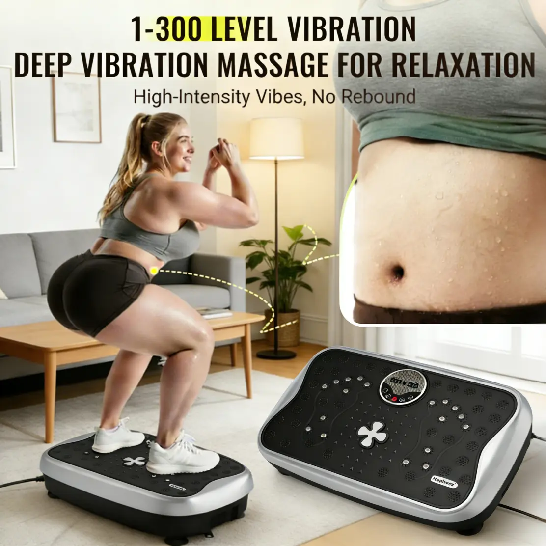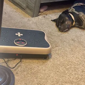 1. 【256lbs Heavy-Duty Stability】- Stronger Than Competitors "Engineered with a reinforced steel frame and anti-slip textured surface, our vibration plate supports up to 256lbs (120kg) – 15% higher capacity than standard 256lbs models. The widened base (32” x 18”) ensures stability during dynamic workouts, while the 2.5mm thickened platform absorbs intense vibrations without shaking." (Reference: Image 8 showing weight test + Image 3 with size comparison)
