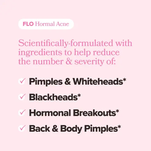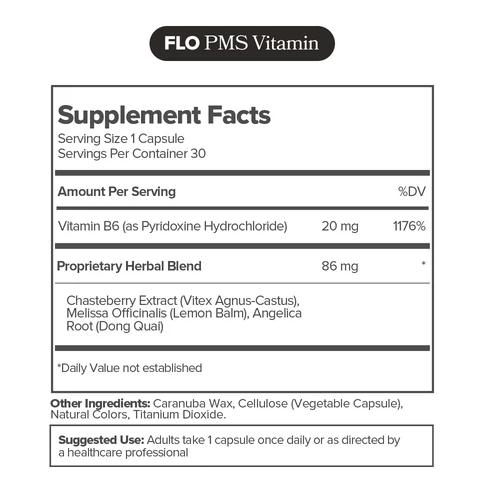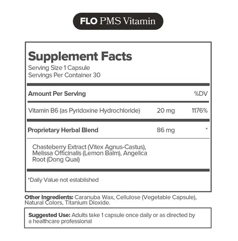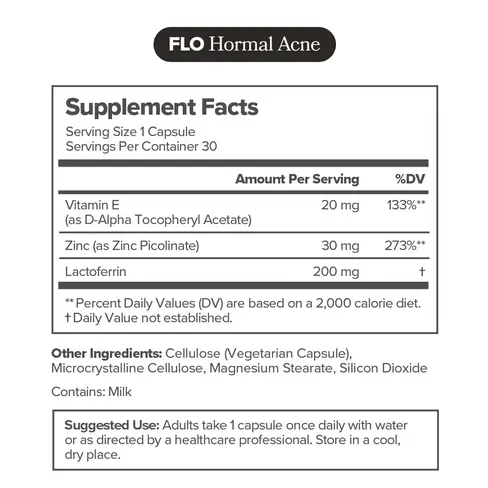 Ingredients30 servings per container. Vitamin B6 (as pyridoxine HCl) 20 mg (1176%),Proprietary Herbal Blend: Chasteberry (Vitex agnus-castus) Fruit Extract,Lemon Balm (Melissa officinalis),Dong Quai (Angelica sinensis) Root 86 mg Other Ingredients:Carnauba Wax,Cellulose (Vegetarian Capsule),Natural Colors,Titanium Dioxide FLO Acne Vitamin Ingredient Facts Serving Size: 1 capsule,30 servings per container. Vitamin E (as D-Alpha Tocopheryl Acetate) 20 mg,Zinc (as Zinc Picolinate),Lactoferrin Other Ingredients: Cellulose (Vegetarian Capsule),Microcrystalline Cellulose,Magnesium Stearate,Silicon Dioxide