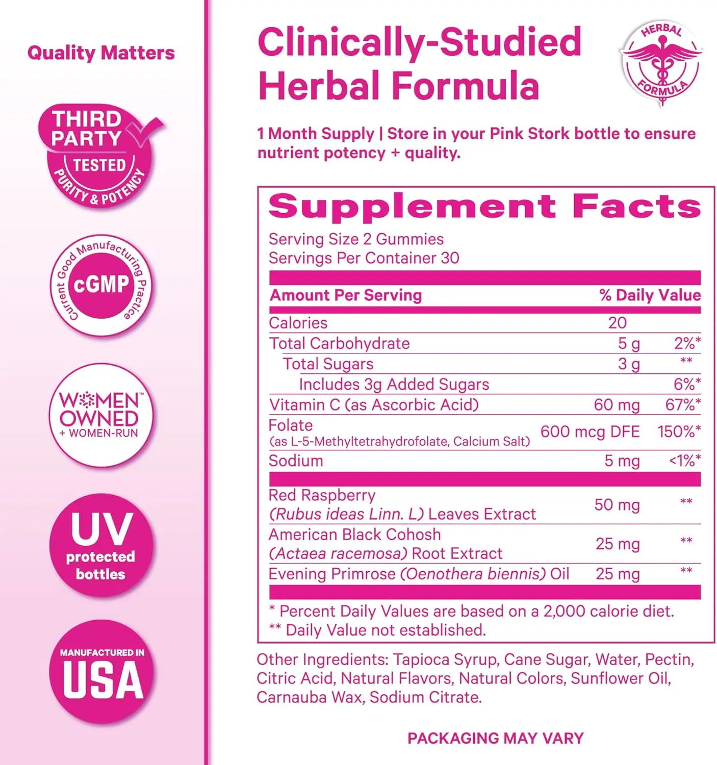 ·Trusted Women’s Wellness — Clean, Tested, Women-Owned Created by women, for women. Pink Stork Hormone Balance Gummies are made in cGMP-certified facilities, third-party tested, and packaged in a UV-protective bottle to ensure purity and potency. Our CEO, a mom of six, built this brand to support real women navigating hormonal health, fertility, and wellness. Over 80% of our company is women-led—and every Pink Stork product reflects our commitment to clean ingredients, real results, and your whole-body hormone harmony.