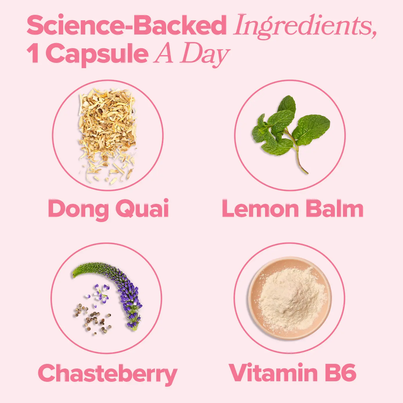 IngredientsVitamin B6 (as pyridoxine hydrochloride), Chasteberry (Vitex agnus-castus) Fruit Extract, Lemon Balm (Melissa Officinalis), Dong Quai (Angelica Sinensis) Root, Organic Tapioca Syrup, Raw Cane Sugar, Water, Natural Flavors, Pectin, Citric Acid, Sodium Citrate, Vegetable Juice (color), Titanium Dioxide (color), Coconut Oil, Carnauba Wax, Beta Carotene (color). Folate, Myo-Inositol, Diindolylmethane, D-Chiro-Inositol, Cellulose (Vegetarian Capsule), Magnesium Stearate, Natural Colors.