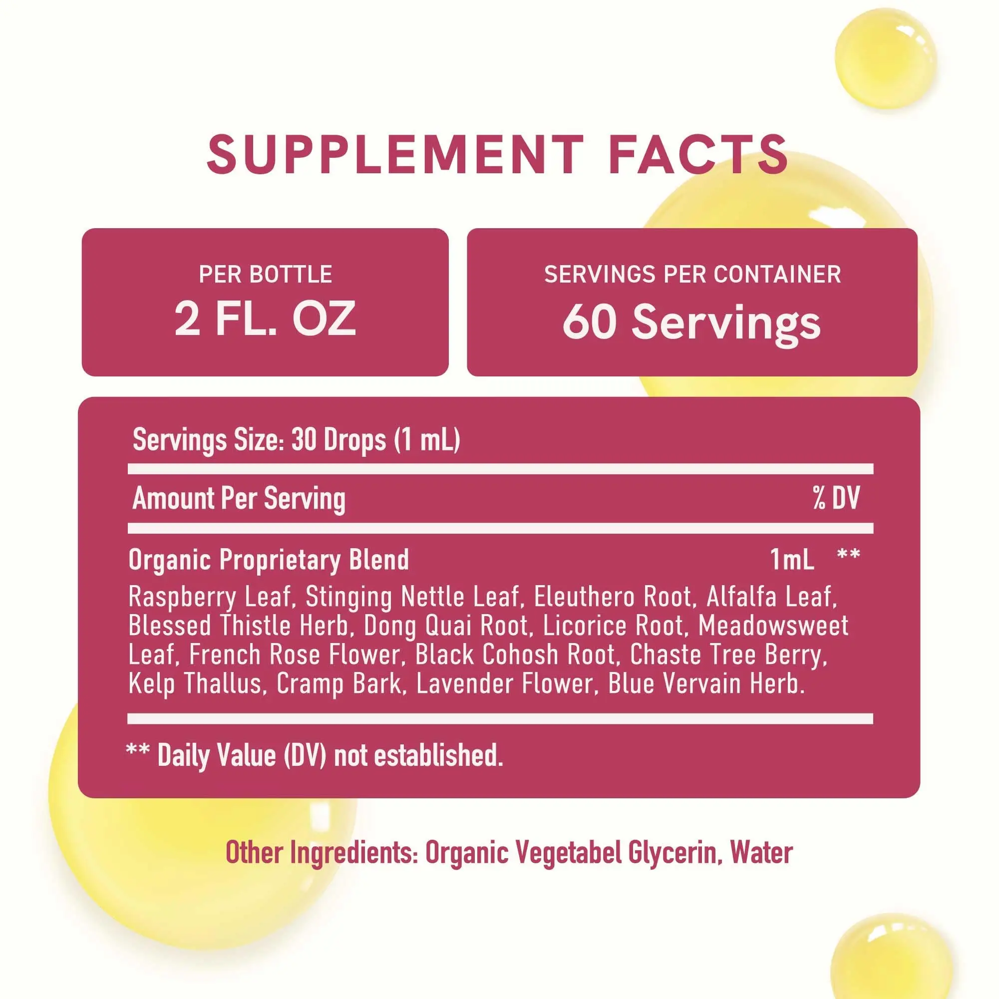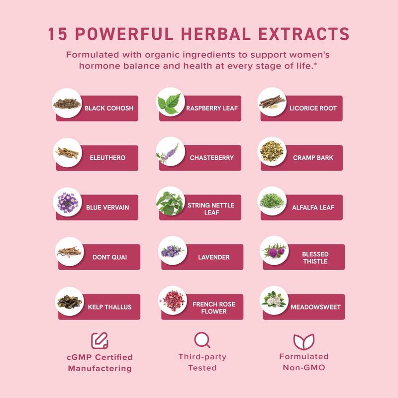 🌿 Organic Liquid Extracts: Our blend features Stinging Nettle Leaf, Red Raspberry, Eleuthero, Dong Quai, Licorice, Meadowsweet, French Rose, Black Cohosh, Chasteberry, Cramp Bark, Lavender, Blue Vervain, and more. All ingredients are organic, ensuring purity and effectiveness.