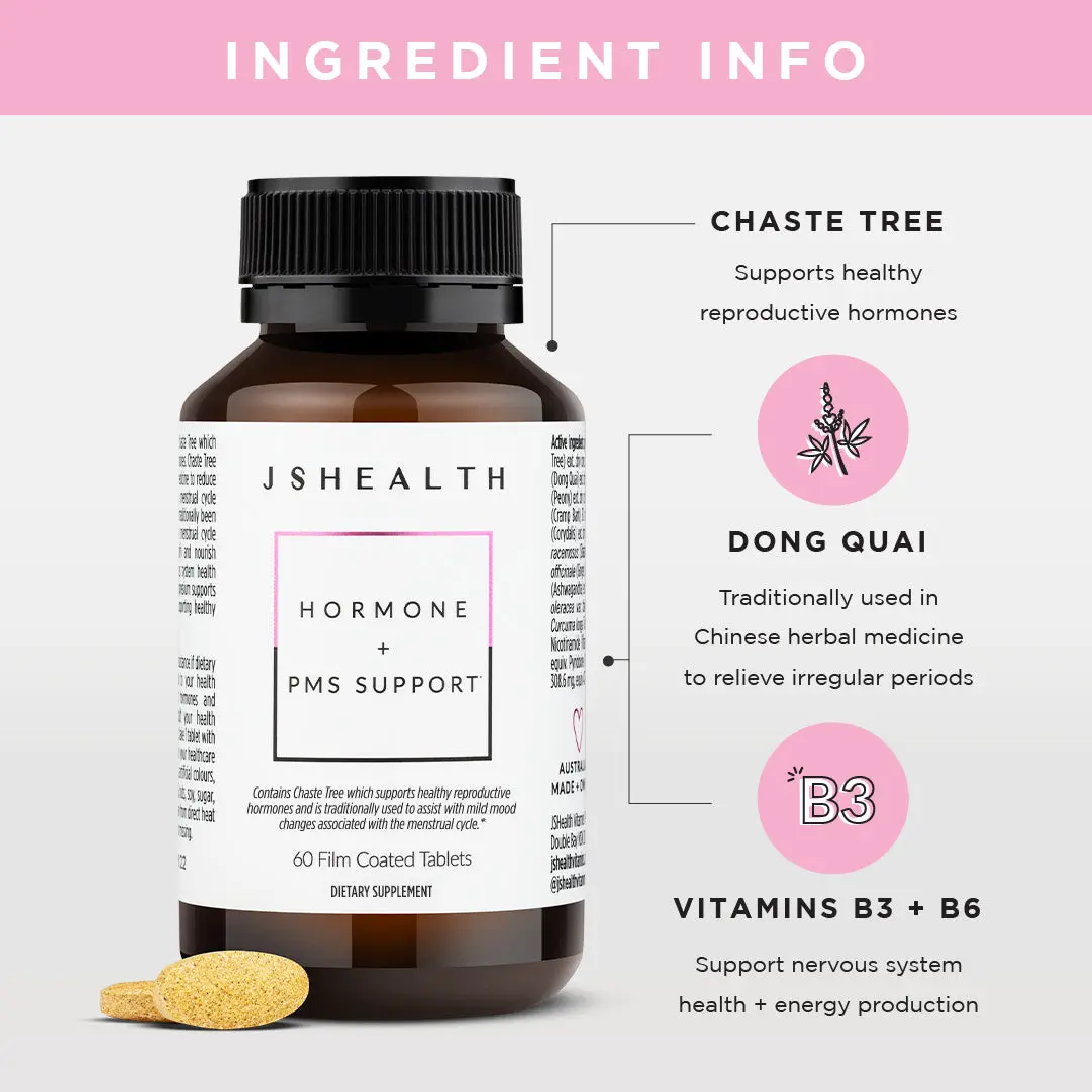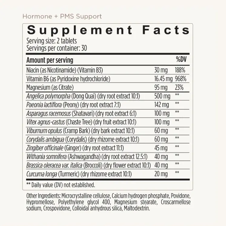 Angelica polymorpha (Dong Quai) extract, Asparagus racemosus (Shatavari), Brassica oleracea var. italica (Broccoli), Corydalis ambigua extract, Curcuma longa (Turmeric) extract, Paeonia lactiflora (Peony) extract, Viburnum opulus (Cramp Bark) extract, Vitex agnus-castus (Chaste Tree) extract, Withania somnifera (Ashwagandha) extract, Zingiber officinale (Ginger) root, Nicotinamide (Vitamin B3), Pyridoxine hydrochloride (Vitamin B6), Magnesium citrate, plus other ingredients: microcrystalline cellulose, calcium hydrogen phosphate, povidone, hypromellose, polyethylene glycol 400, croscarmellose sodium, crospovidone, magnesium stearate, colloidal silica, maltodextrin. Contains sulfites.