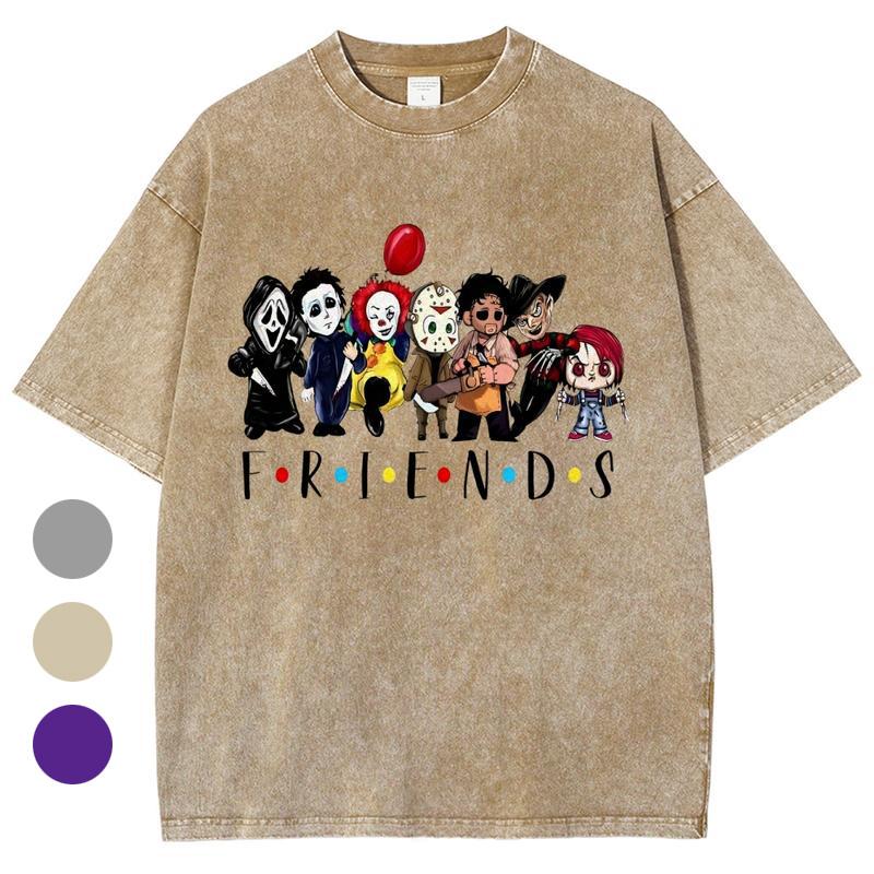 Horror Movie Friends Washed T-Shirt, Women's Graphic Tees, Unisex Fit Soft Breathable Casual Top, Fashion Streetwear, Outfits For All Seasons
