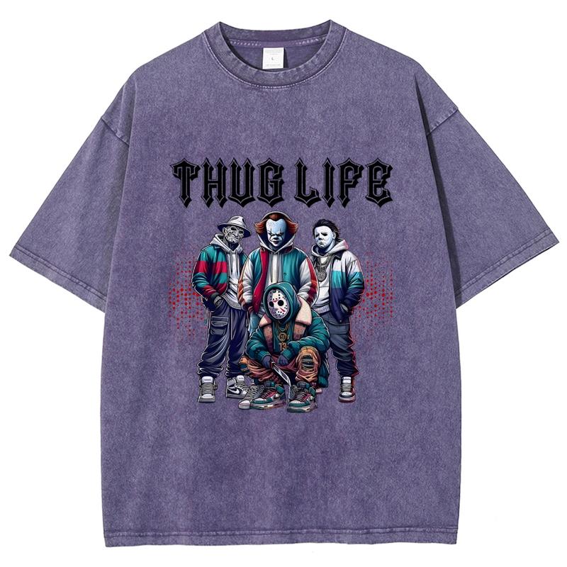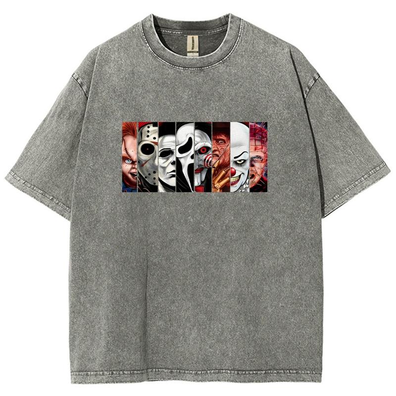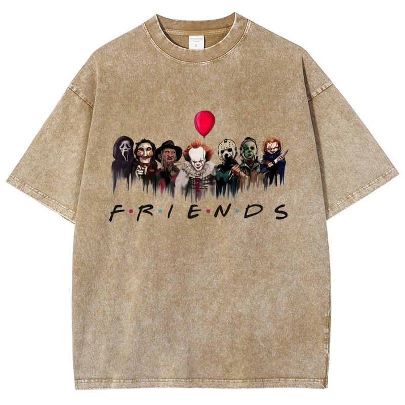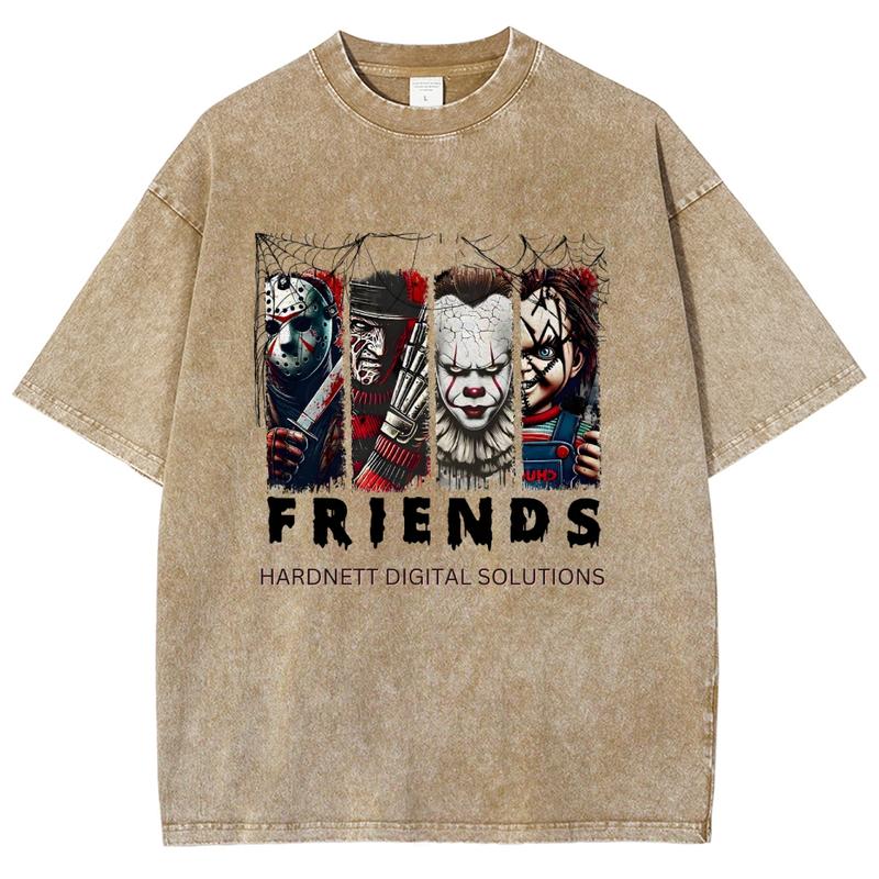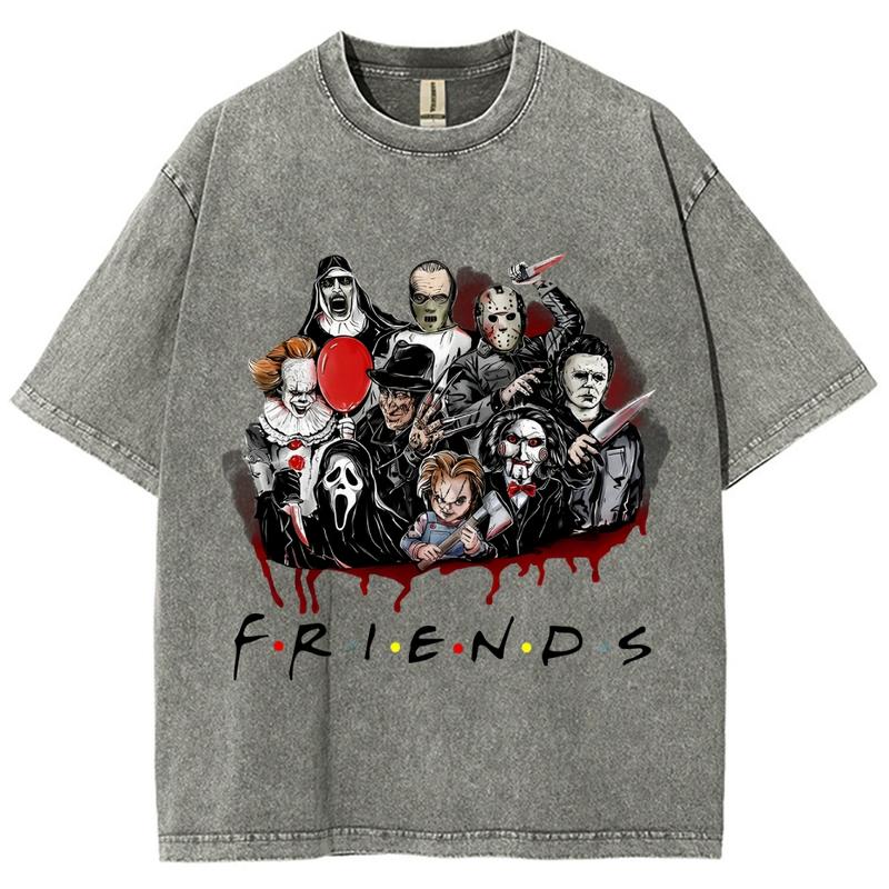 5. Horror Movie Friends Washed T-Shirt, Women's Graphic Tees, Unisex Fit Soft Breathable Casual Top, Fashion Streetwear, Outfits For All Seasons