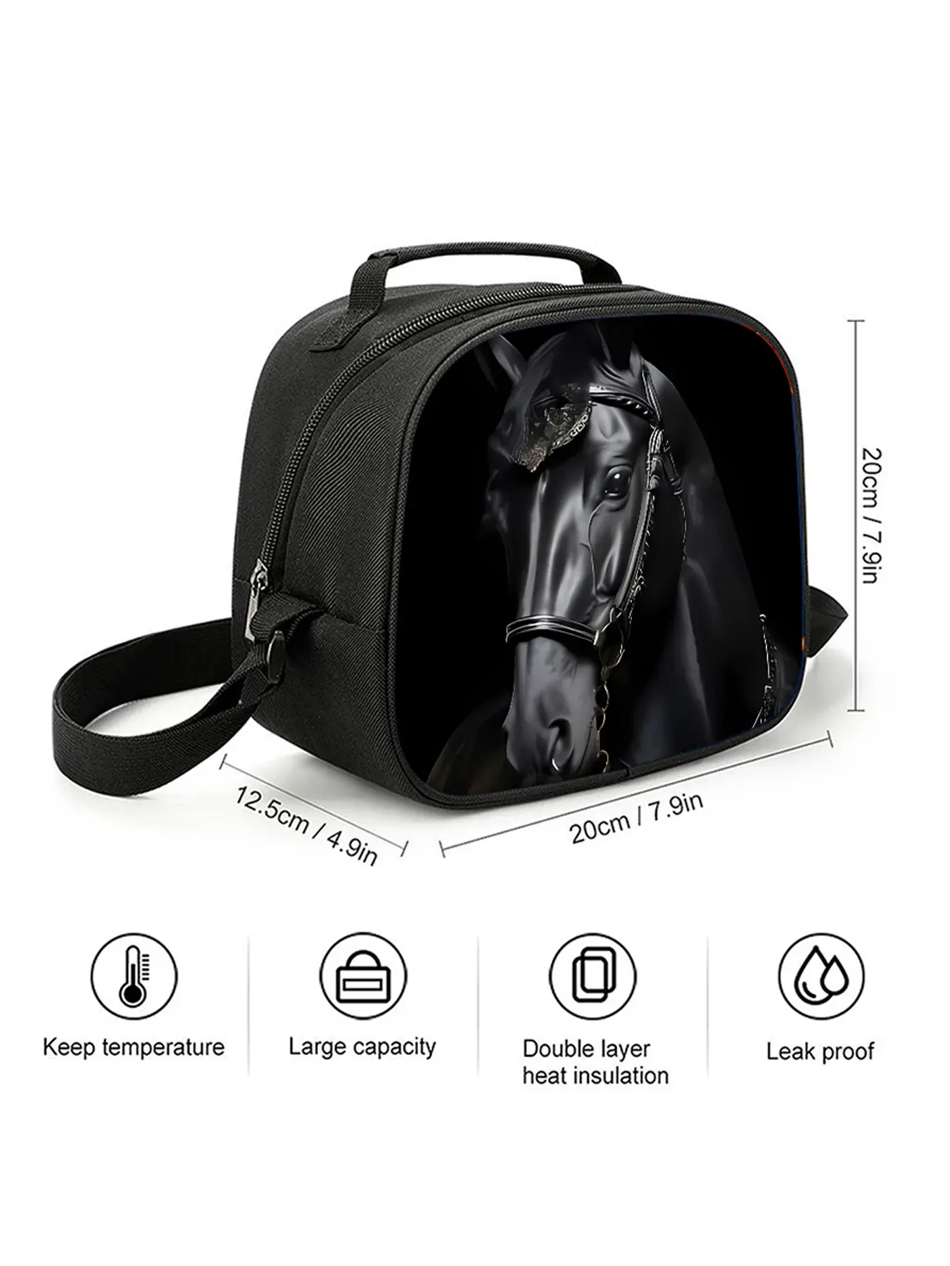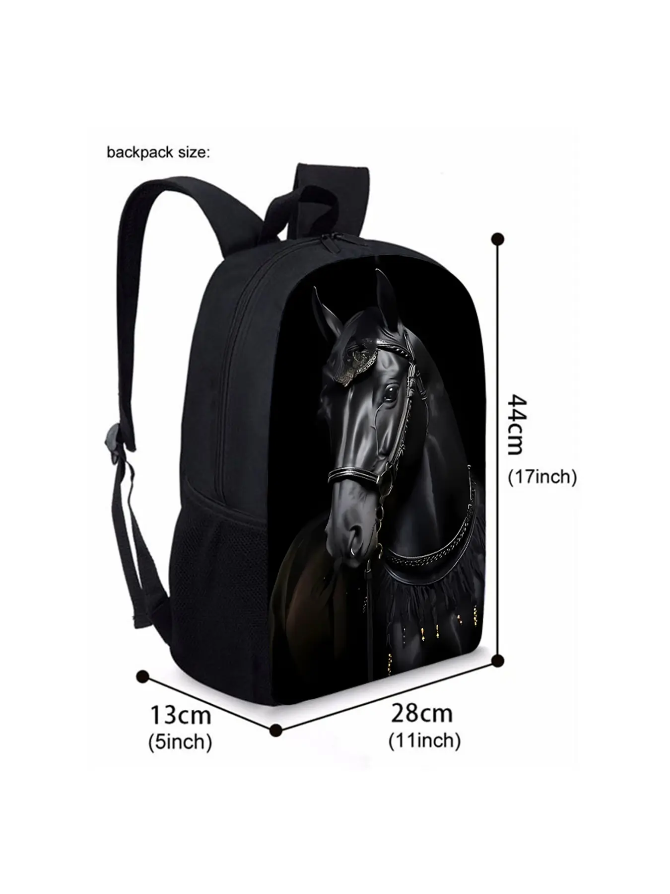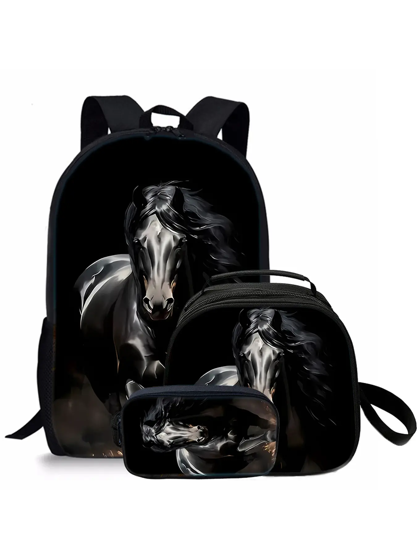 Horse pattern printed 17-inch backpack three-piece set (single-layer backpack + round lunch bag with shoulder strap + single-layer pencil case)