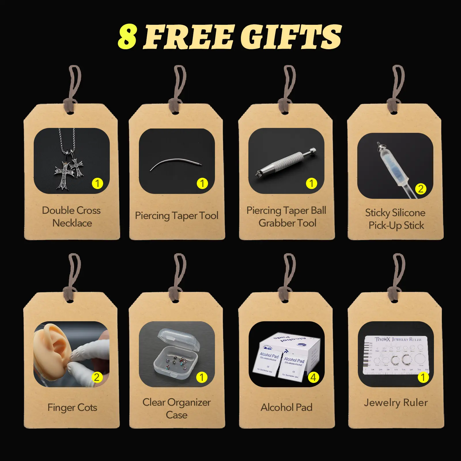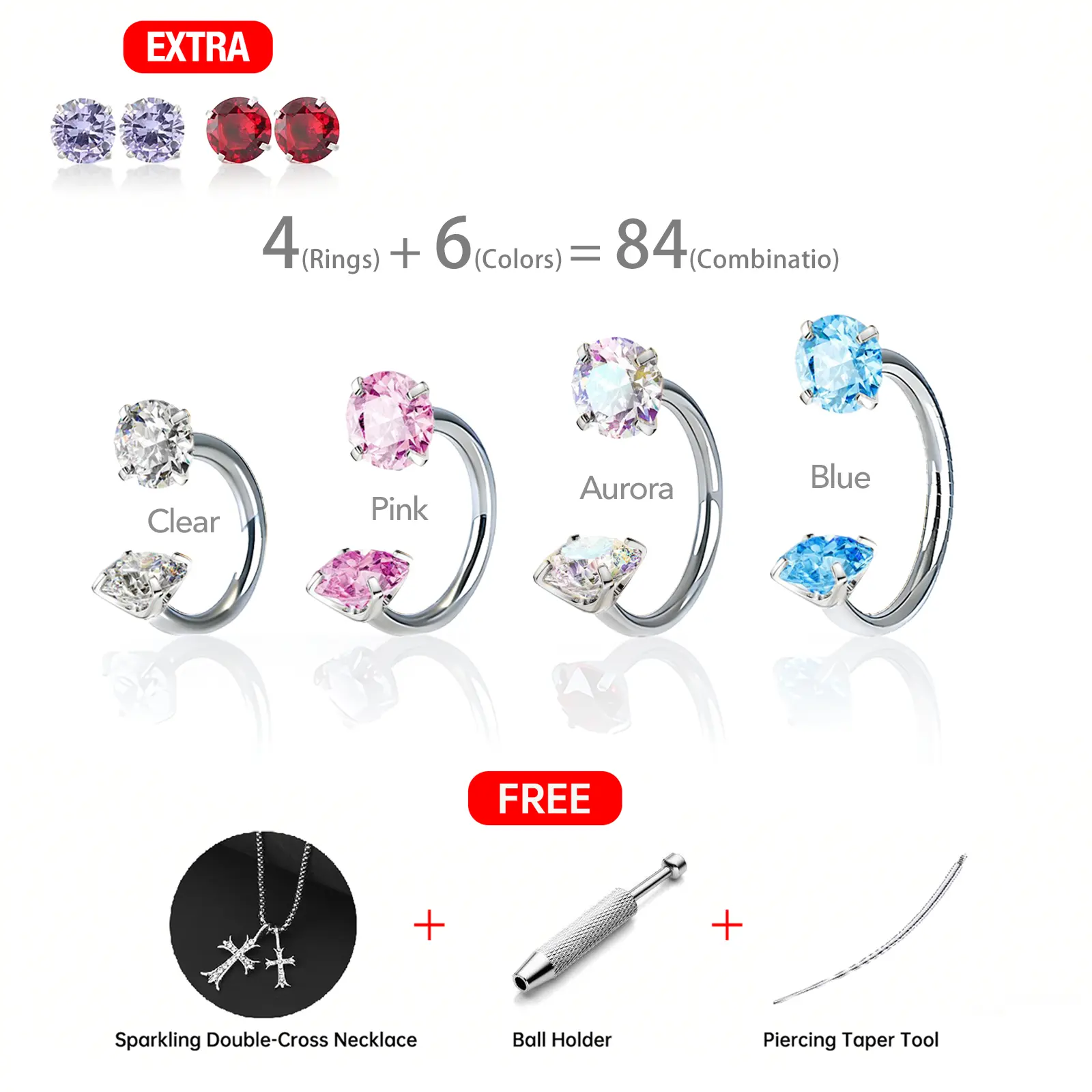 🎁 Free Gifts & Accessories 🎁 - Sparkling Double-Cross Necklace - Piercing Taper Ball Grabber Tool - Piercing Taper Tool - Sticky Silicone Pick-Up Stick - Finger Cots - Clear Organizer Case - Alcohol Pad - Jewelry Ruler
