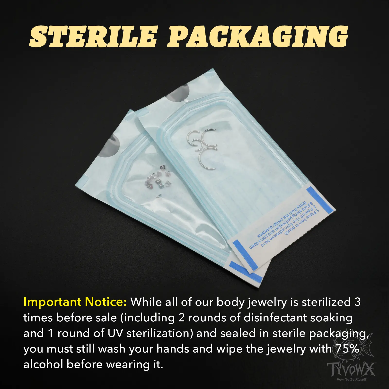 📦 Packaging & Care 📦 - Sterile-sealed pouches packaging - Sterilized 3 times before sale (disinfectant soaking, UV sterilization) - Wash hands and wipe jewelry with 75% alcohol before wearing - Avoid harsh chemicals and cosmetics - Seek professional advice if irritation occurs - Clean with sterile saline before handling