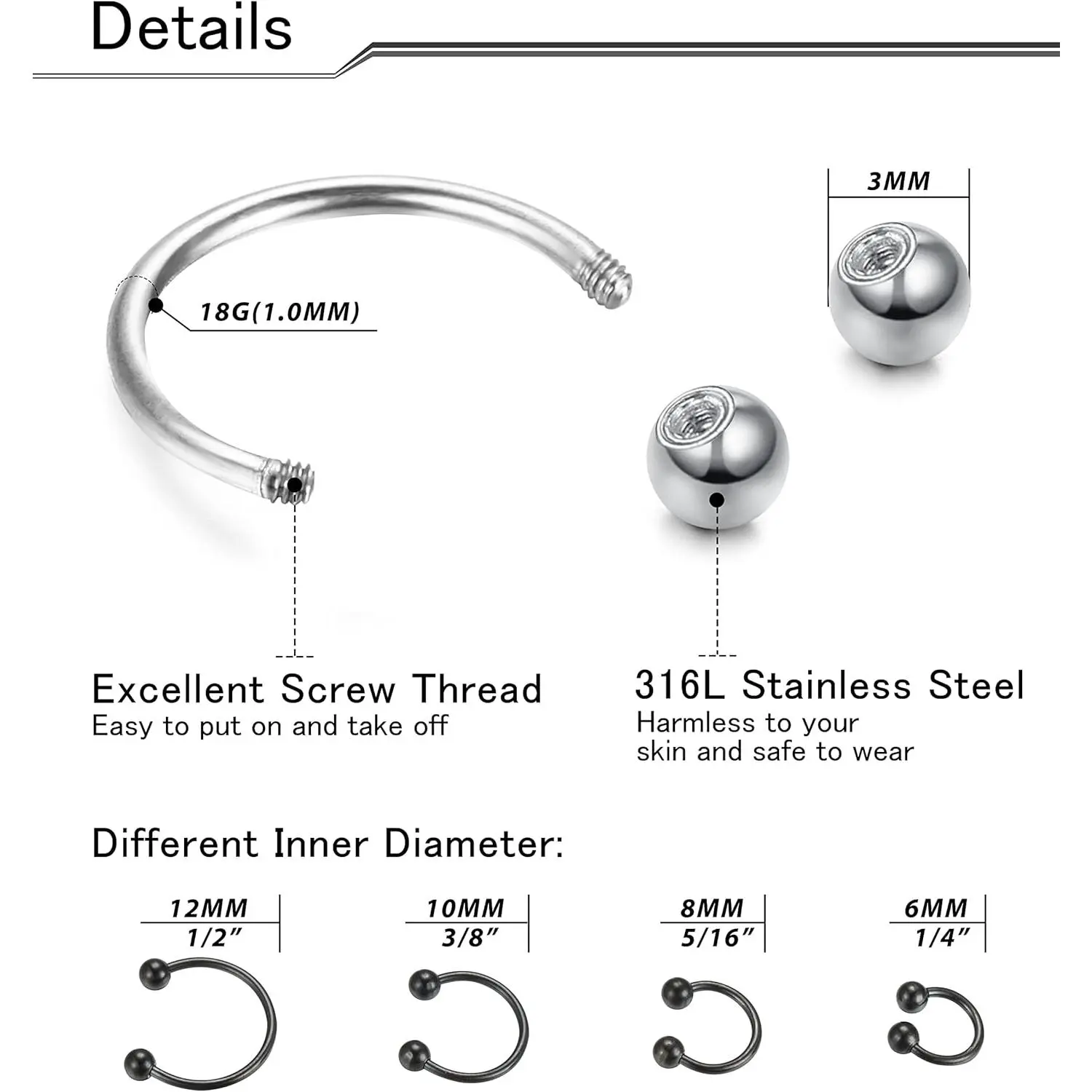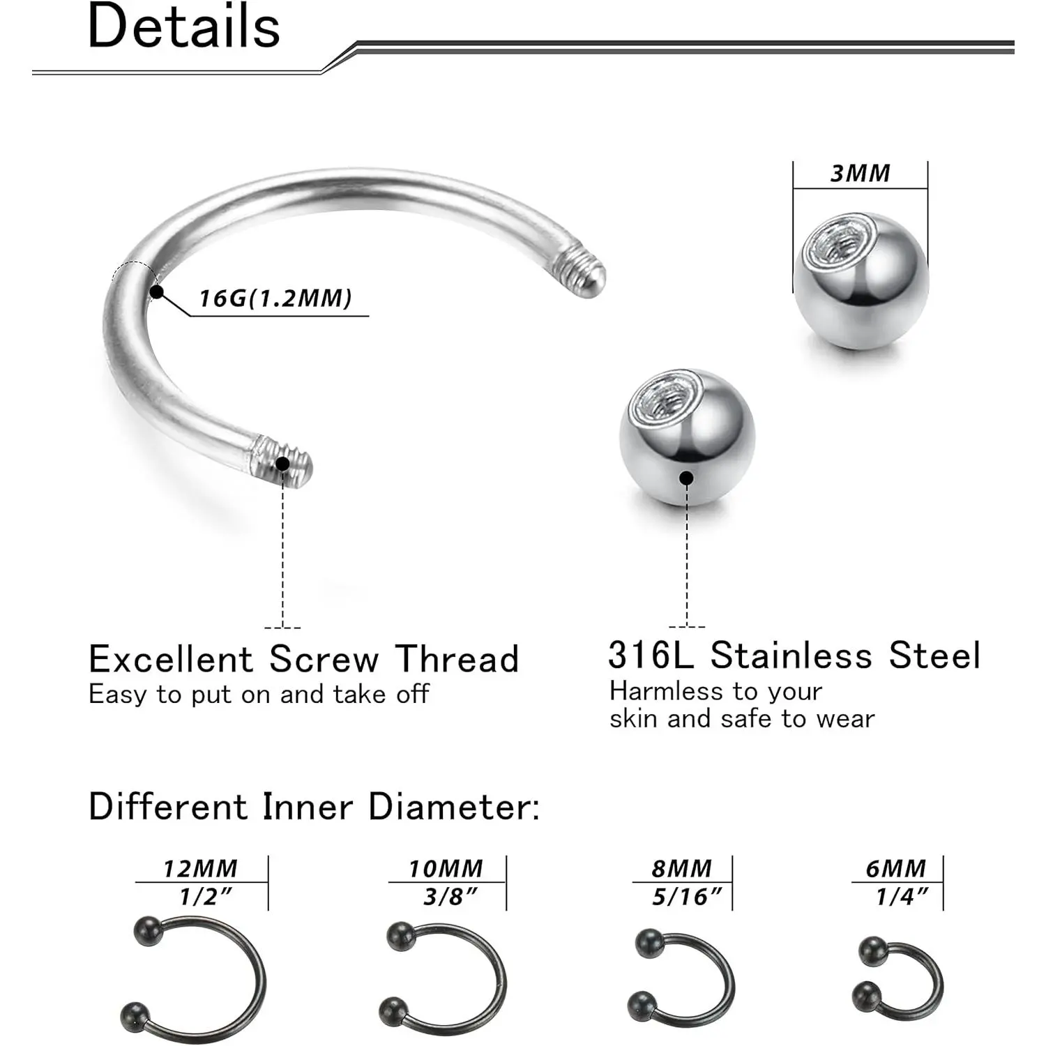 Different sizes of stainless steel septum ringare suitable for wearing on various body parts