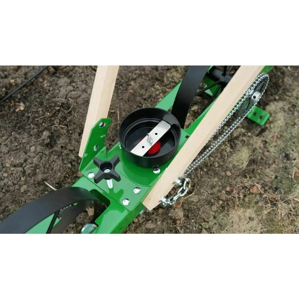 The Hoss Garden Seeder has a rolling coulter or rolling disk that opens a furrow for the dropping seed. This double disk furrow opener works great in soils that have heavy organic residue from prior vegetable or cover crops. Once the seed drops into the planting furrow, the drag chain covers the seed and the rear wheel packs the soil to ensure optimal germination.