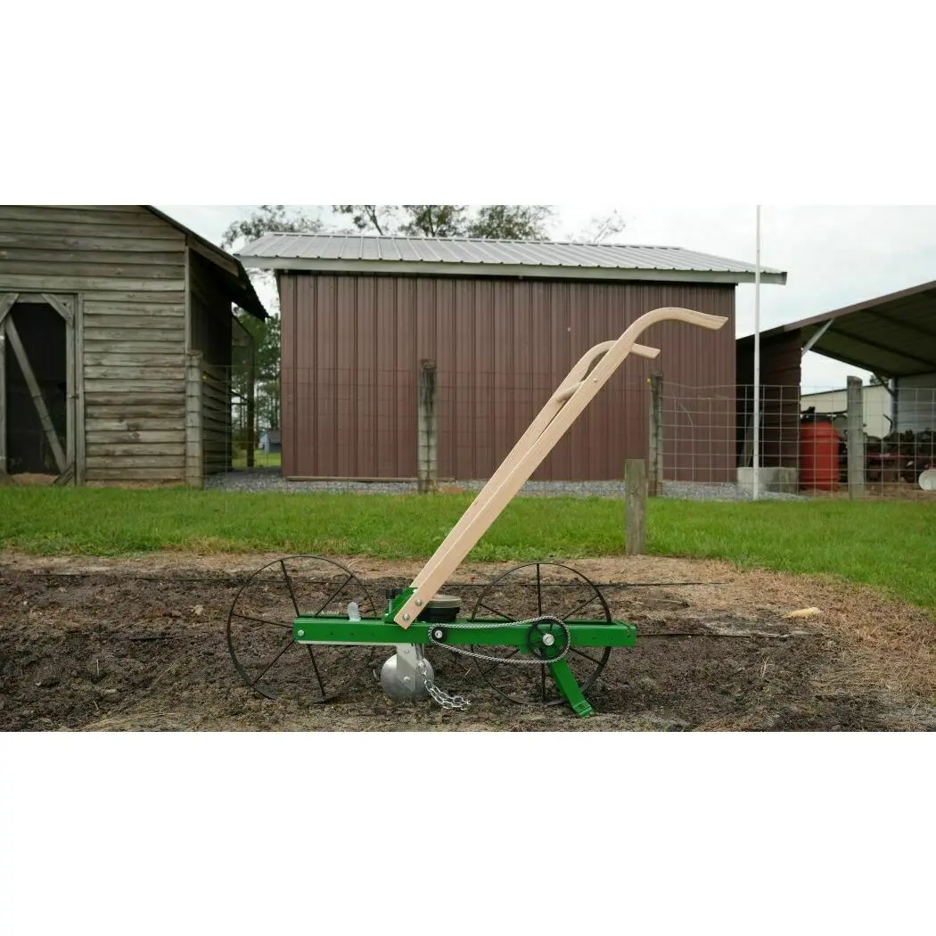 The Hoss Garden Seeder is constructed with Amish-crafted hardwood handles, 15 steel wheels, and a powder-coated steel frame. The handles are adjustable to the users height. The steel frame ensures the unit is stable and easy to push in a straight line along the row.