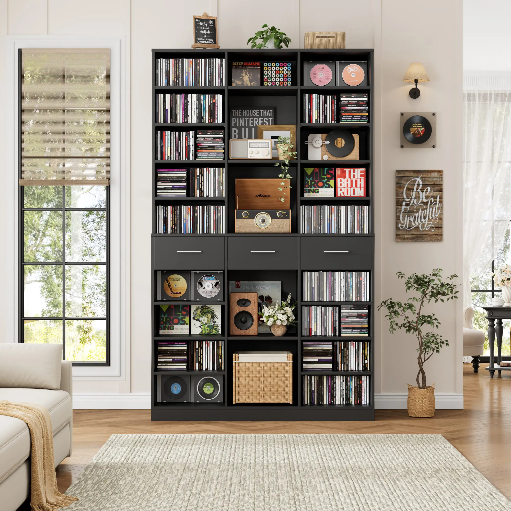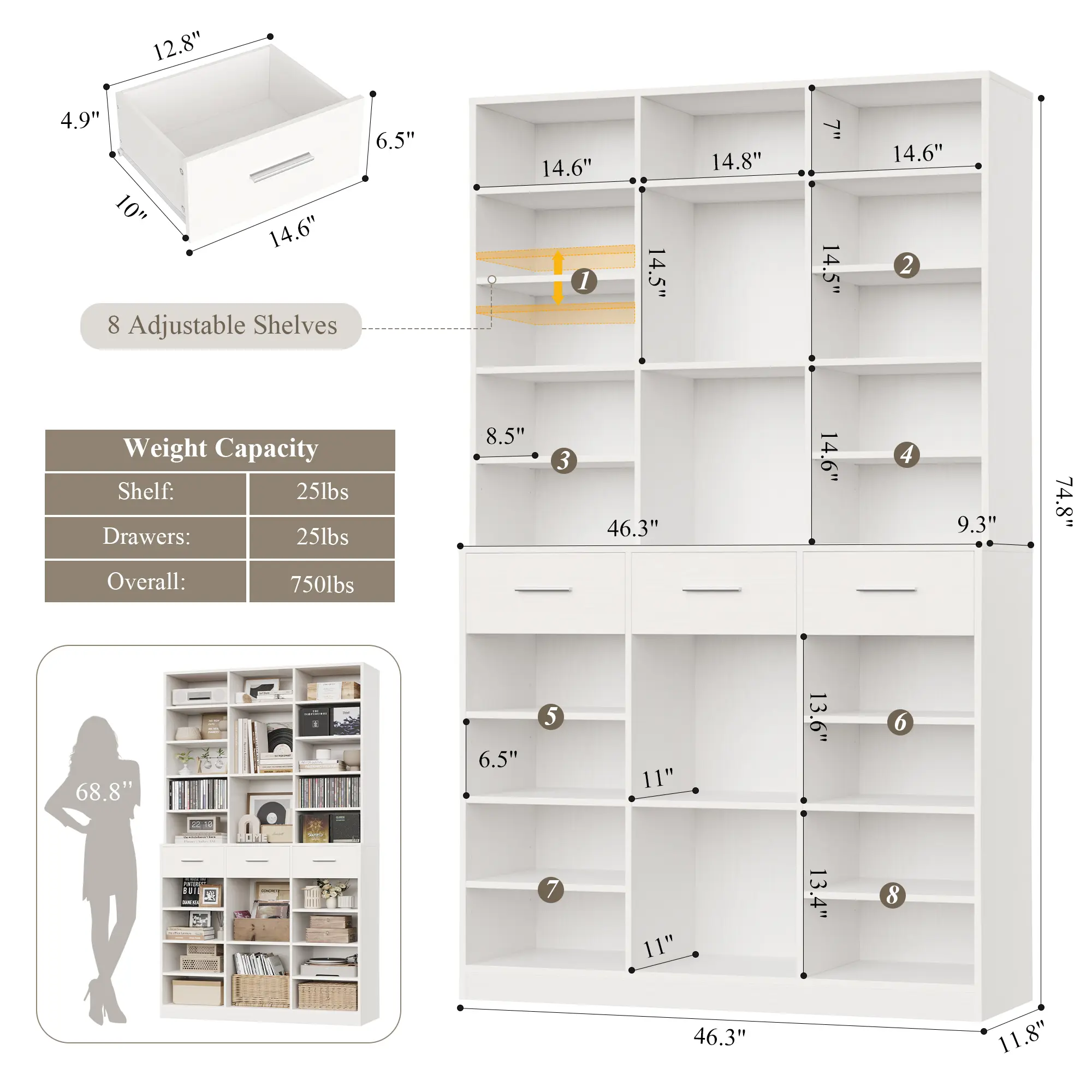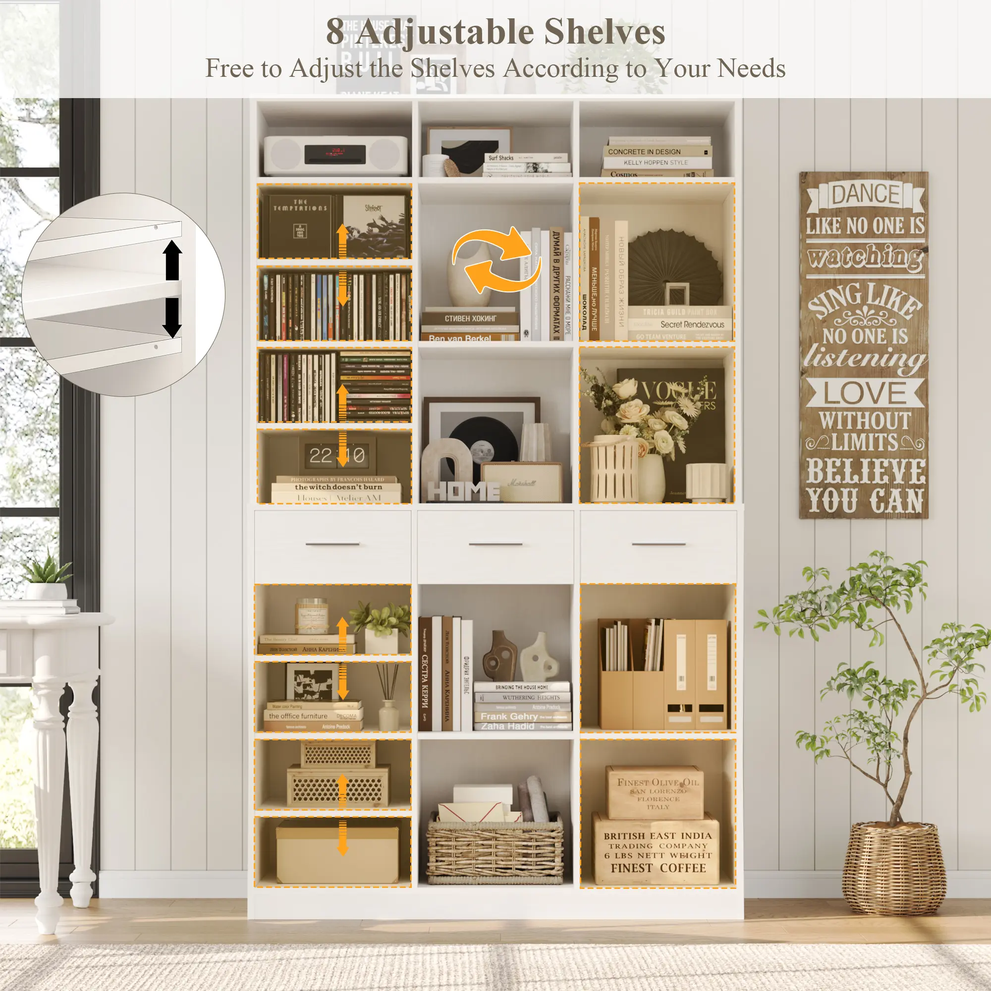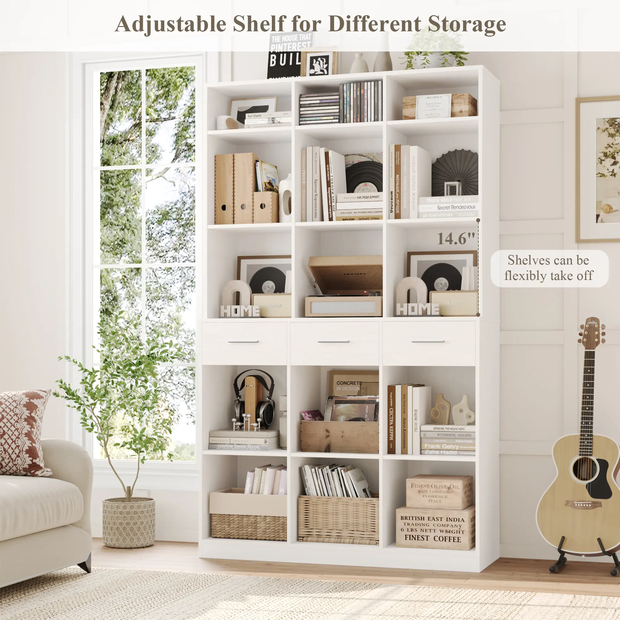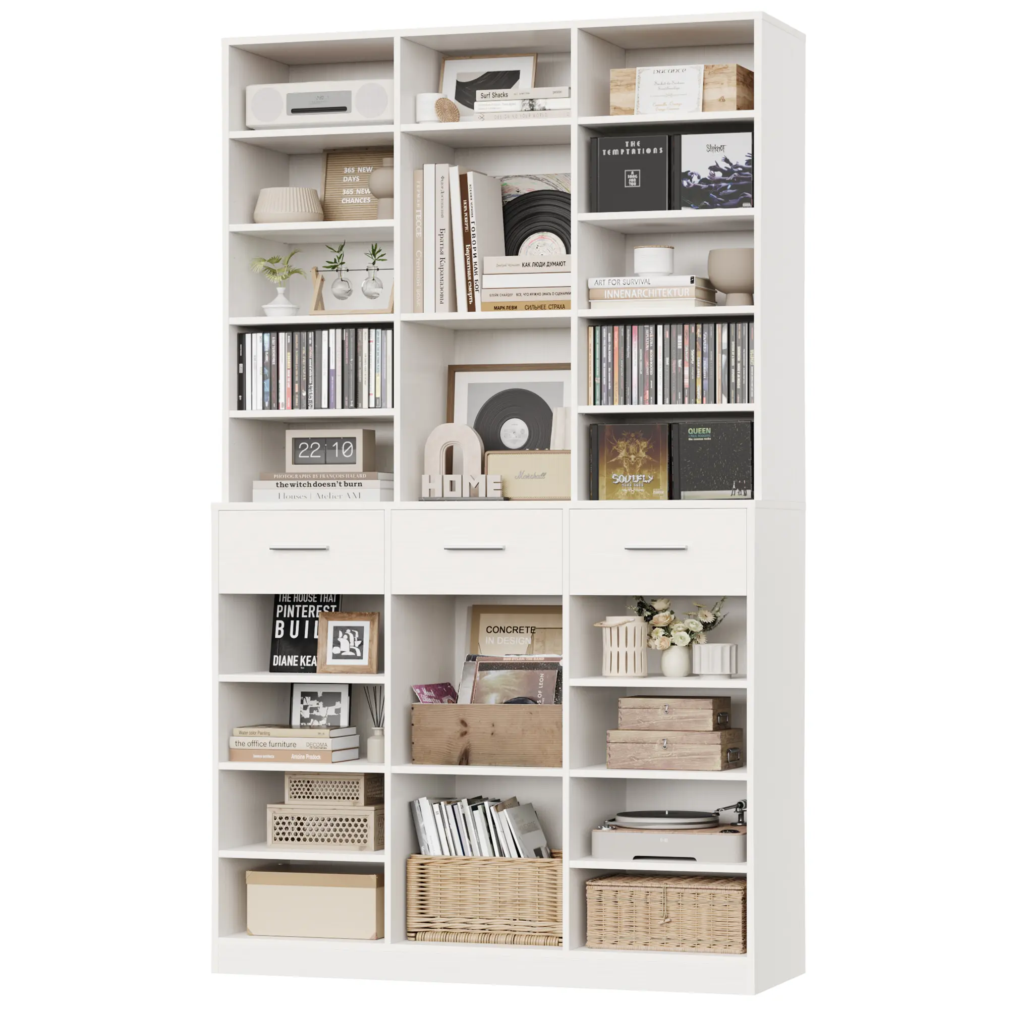 ·Extra Tall Space-Saving Structure: With 3 column width storage, this bookshelf offers generous, flexible shelving and 3 easy-glide deep drawers. It keeps things organized and tidy, enhancing vertical storage space.
