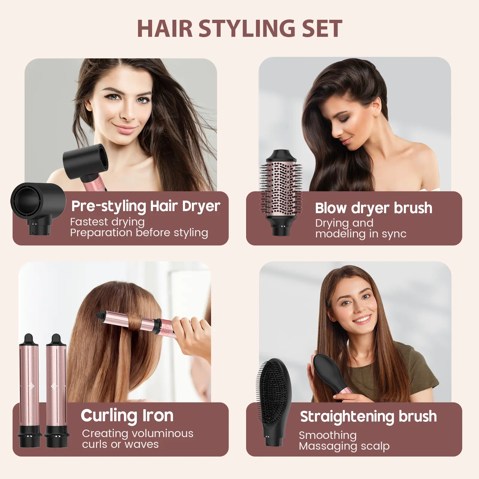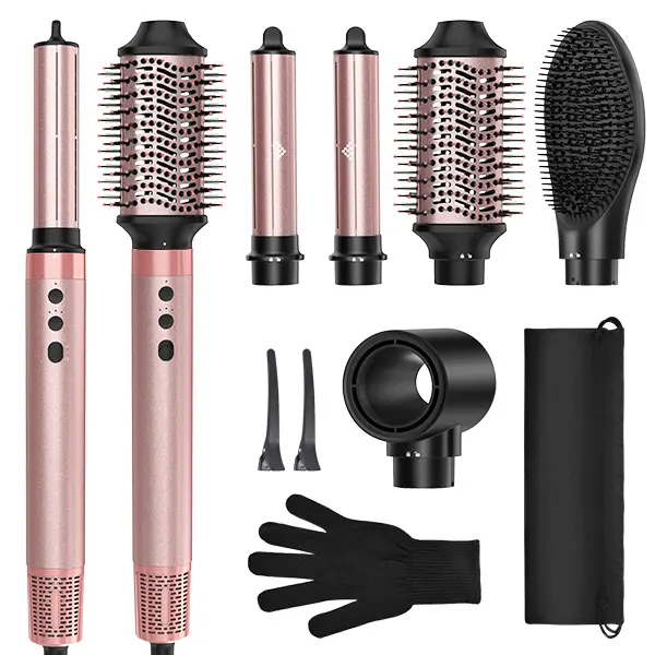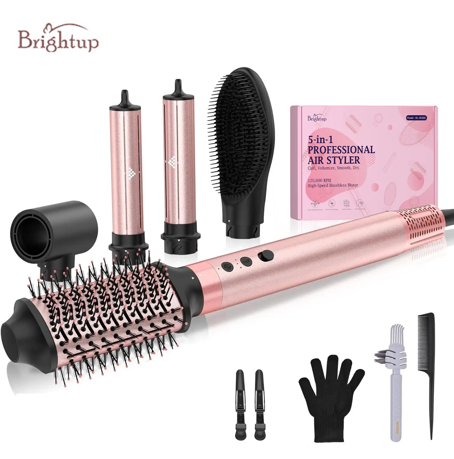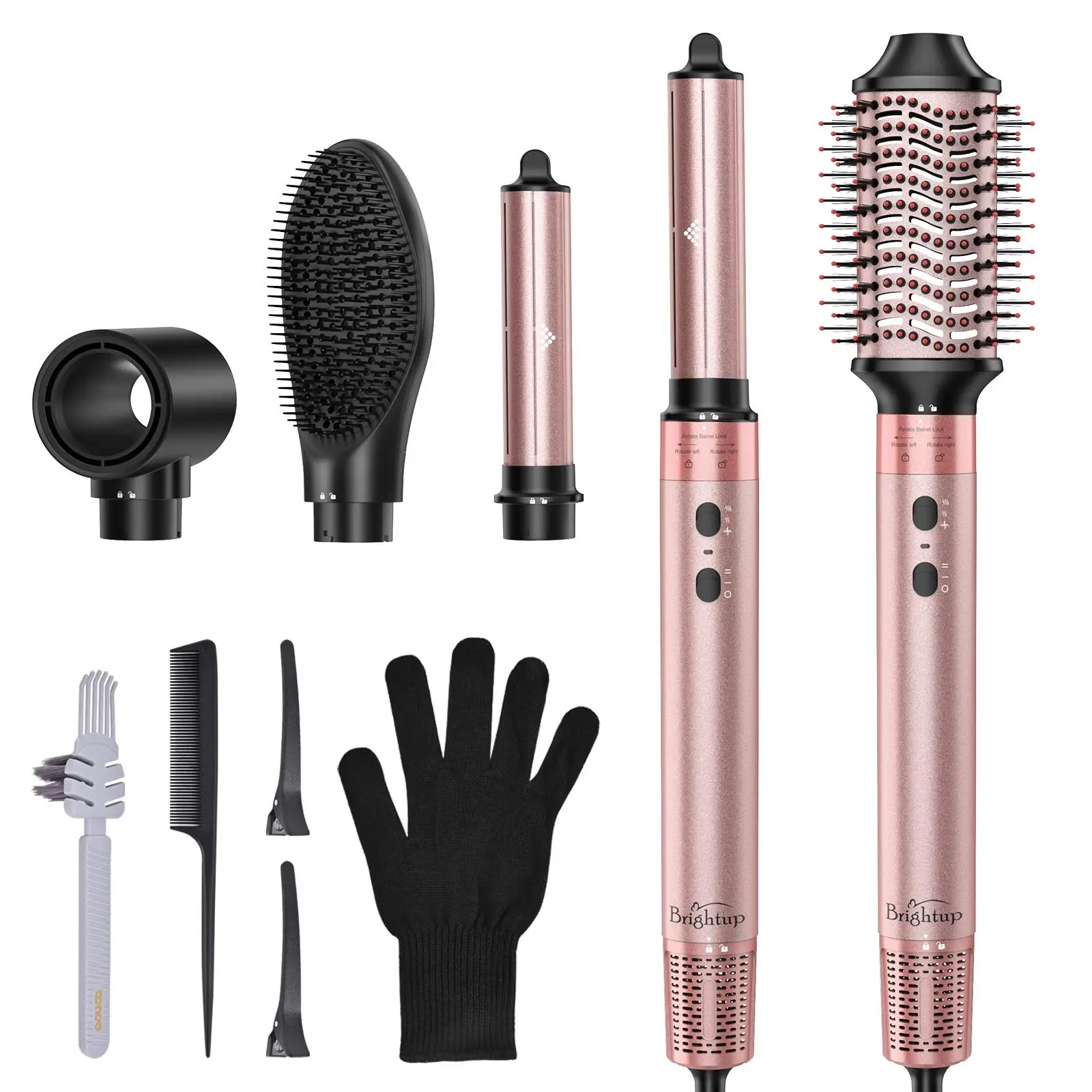 Meet all your styling needs with the Brightup 5-in-1 Multifunctional Air Styler. This versatile tool combines a hair dryer, rotating curling irons, a volumizing brush, and a smoothing straightener, saving you time and money. It includes hair clips, a cleaning brush, a storage bag, and a heat protective glove.