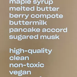I was so genuinely surprised by this brand. The packaging itself was a luxury experience. The scent is so sweet and gourmand, lasting on your skin for hours later. It smells edible, like a syrup soaked pancake with a hint of blueberry. It is perfect for the cozy upcoming fall weather.