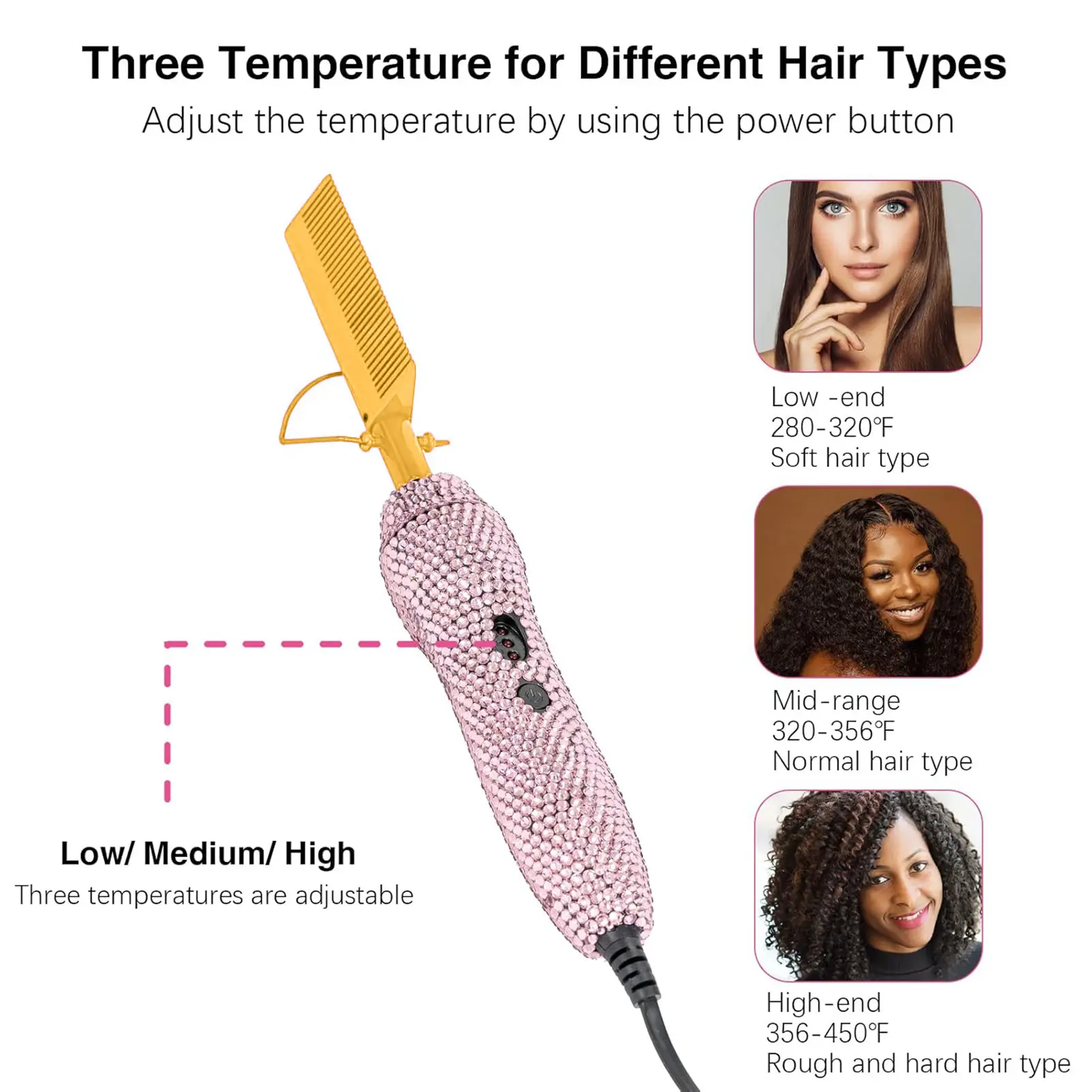 ·【Temperature Adjustable】The hair straightener has three levels of temperature adjustment: low/medium/high, the temperature can be between 430-450℉, you can choose the right temperature according to different hair quality. Hot comb electric for wigs fully meets the needs of your life!