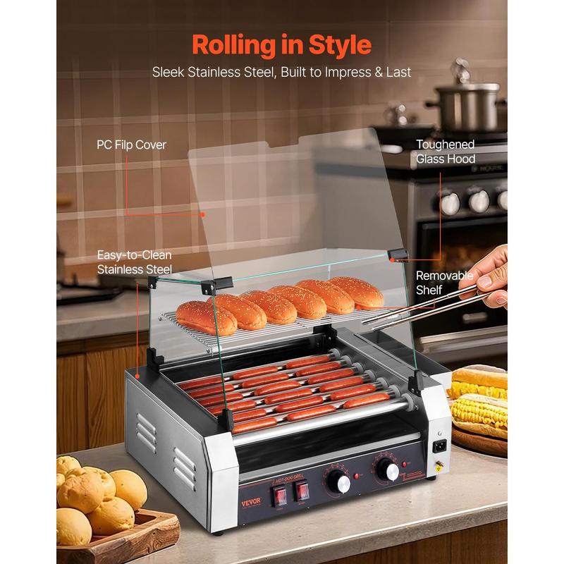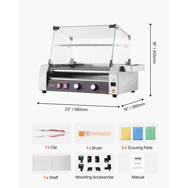 • Built to Impress & Last: Built with a durable, sleek stainless steel frame, this commercial hot dog roller provides not only a modern look but also long-lasting performance. The glass hood is offered to block dirt and keep food warm, thus shortening cooking time. The removable drip tray keeps your kitchen clean and washing to a minimum