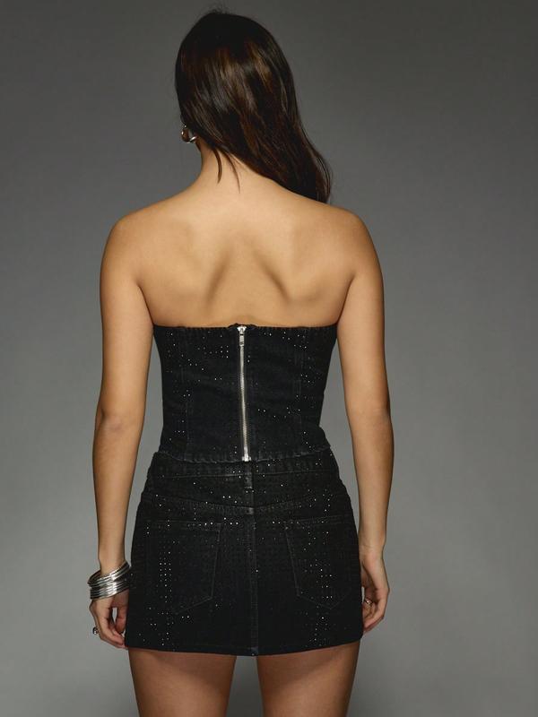 5. Hot Fix Diamante Embellished Denim Mini Skirt, Glam Party Club Festival, Strapless Rhinestone Crystal Fitted Mini Dress, Seasonal Fashion