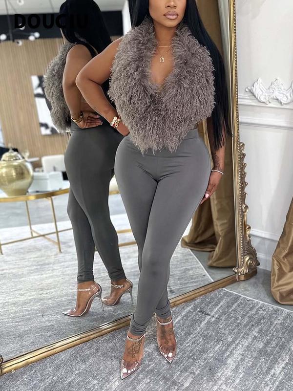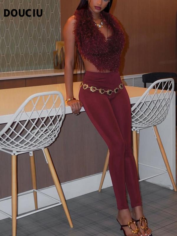 DOUCIU Nightclub Dance Bar Sexy Hot Street Fashion Personality Hip-Hop Cool Women'S Thin Solid Color Plush Halter Vest Tight Long Two-Piece Set