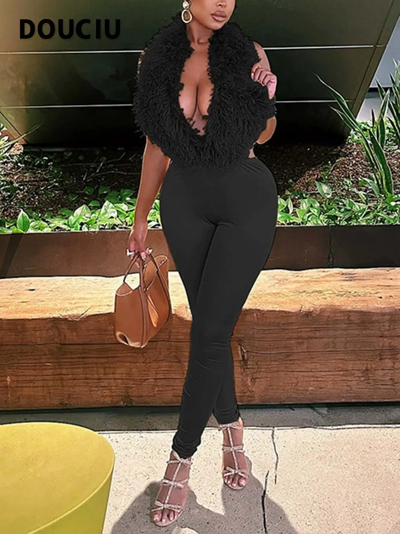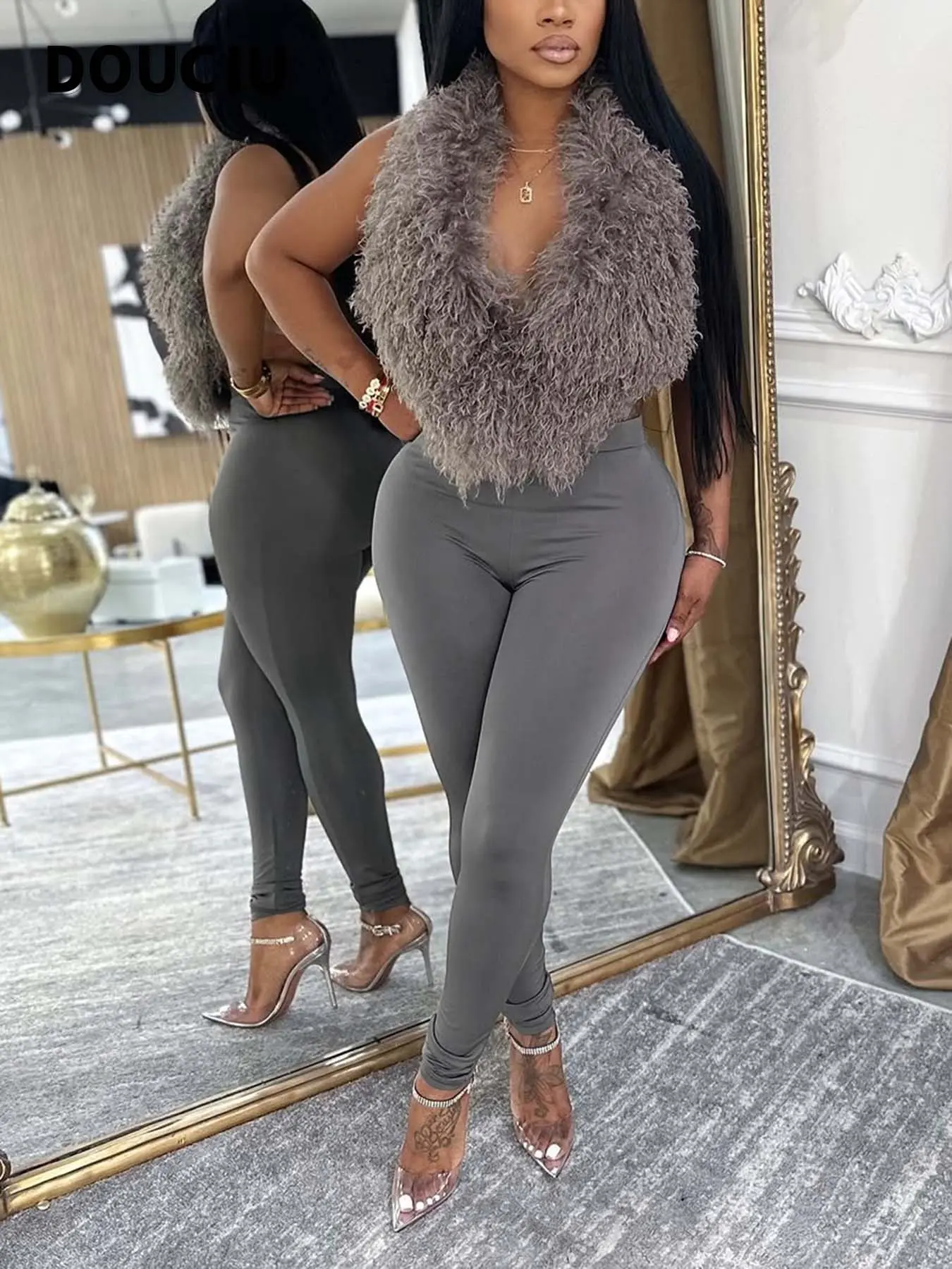 5. DOUCIU Nightclub Dance Bar Sexy Hot Street Fashion Personality Hip-Hop Cool Womenswear Women'S Thin Solid Color Plush Halter Neck Vest Tight Long Two-Piece Set