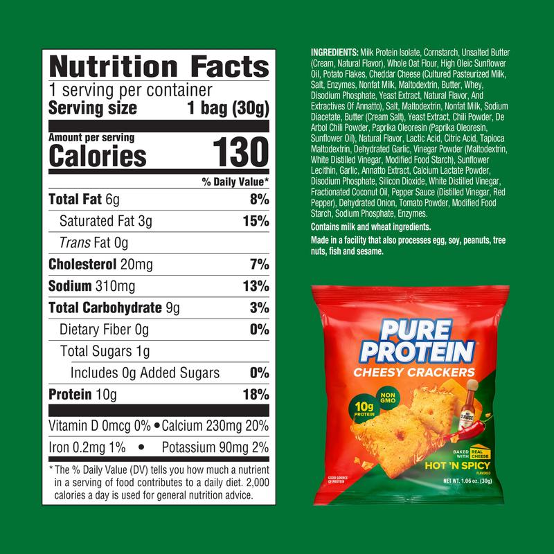 NEW Pure Protein Hot ‘N Spicy Cheesy Crackers are the perfect bold flavor-packed snack. Crafted with 10g of protein and only 130 calories, our Hot ‘N Spicy Cheesy Crackers are made with real cheese and are big on spicy flavor to satisfy those crunchable cravings. Each delicious handful is non-GMO, has no trans fats, and is packed with calcium for strong bones. Whether you’re snacking at home or looking for an on-the-go sports nutrition snack, Pure Protein Hot ‘N Spicy Cheesy Crackers come in individual packs for a delicious portable protein snack.