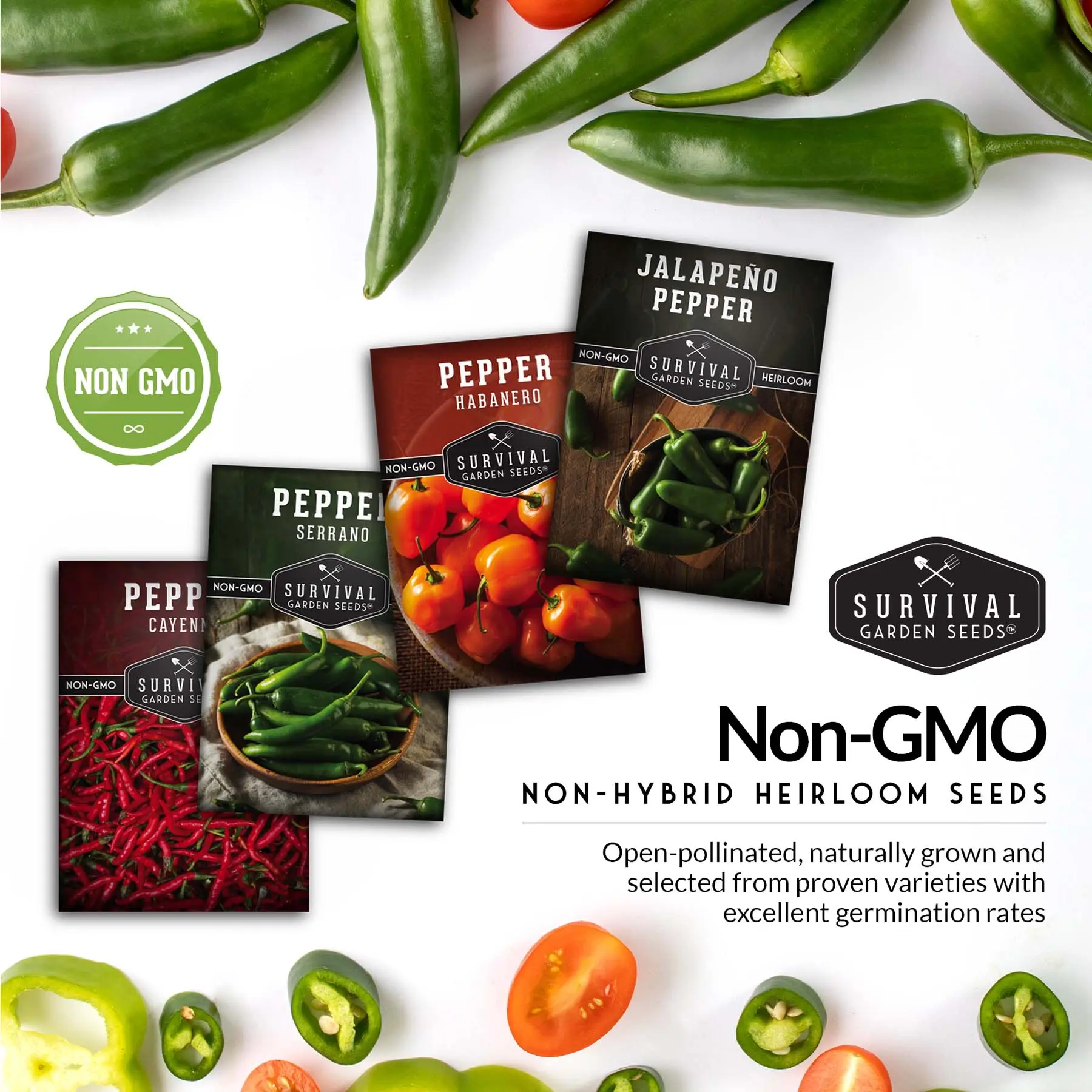 Survival Garden Seeds Hot Pepper Collection - Habanero Cayenne Jalapeno Serrano Heirloom Non-GMO Seeds for Fresh Canned or Dried Storage
