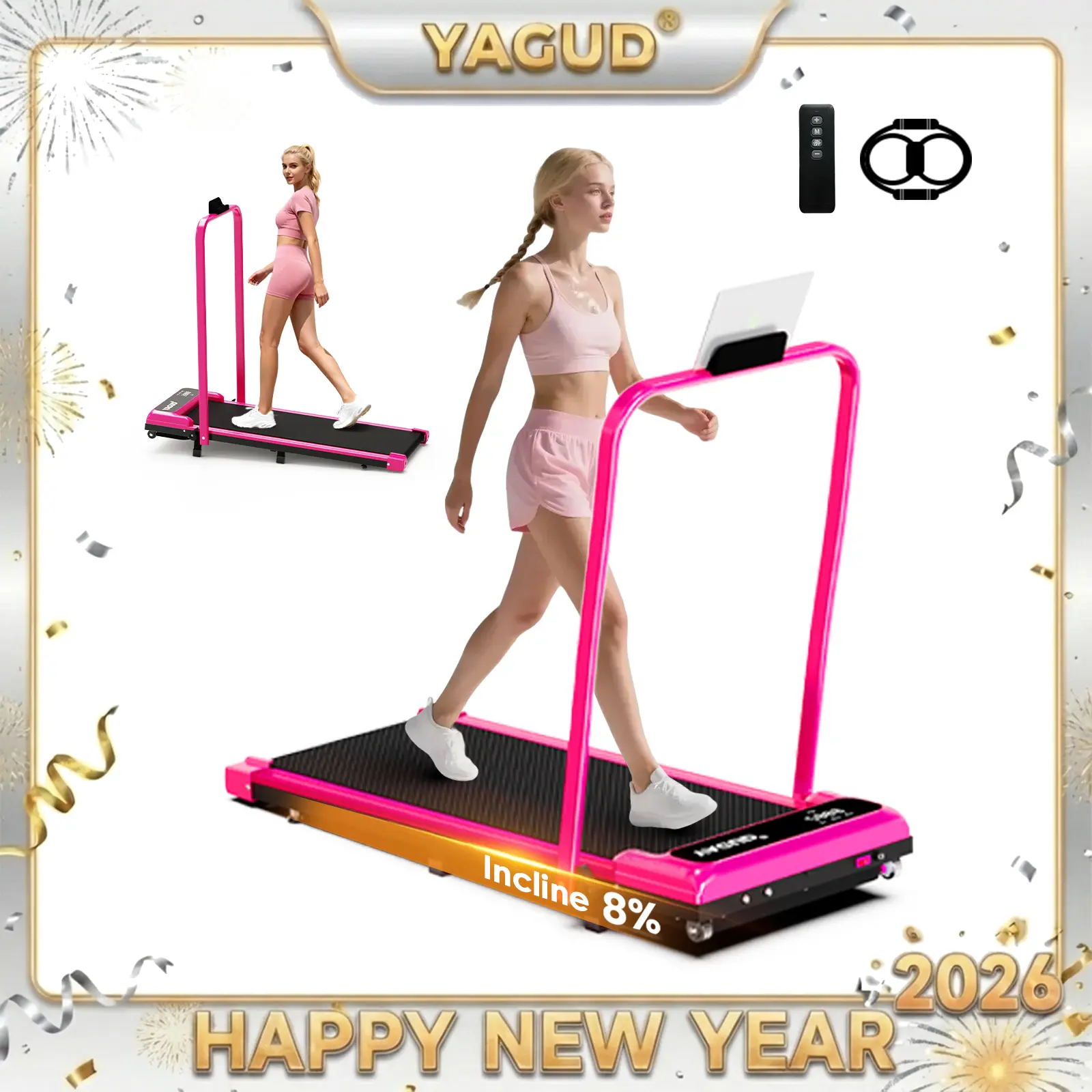 5. 【LIVE ONLY】 HOT PINK! Foldable Walking Pad Treadmill by YAGUD, Low-Noise Motor, 265 lb Capacity, Dual Shock Absorption, Remote Control with Wheels, Includes Free Resistance Bands SpringStatements