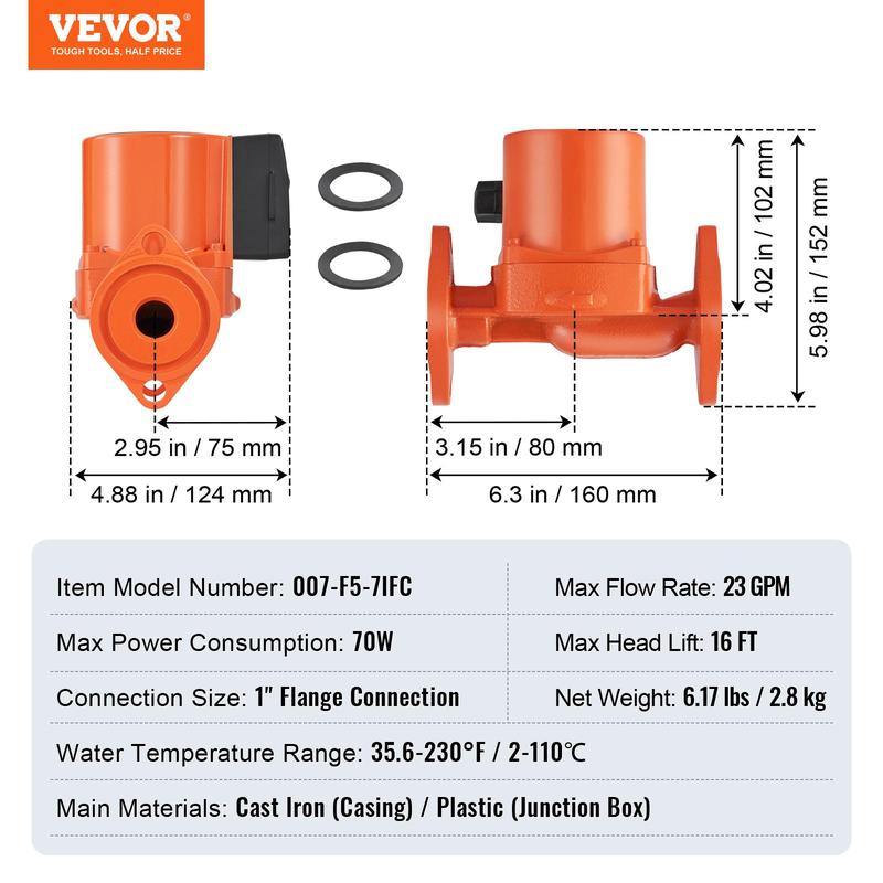 • High Compatibility Design: Replacement part number: 007-F5-7IFC. Engineered specifically for underfloor heating systems, this cast iron circulator pump offers a maximum flow rate of 23 GPM and a head of 16 ft. With a 1" flange connection, it seamlessly replaces your existing hot water recirculating pump, meeting the circulation needs of both homes and complex piping networks with ease.