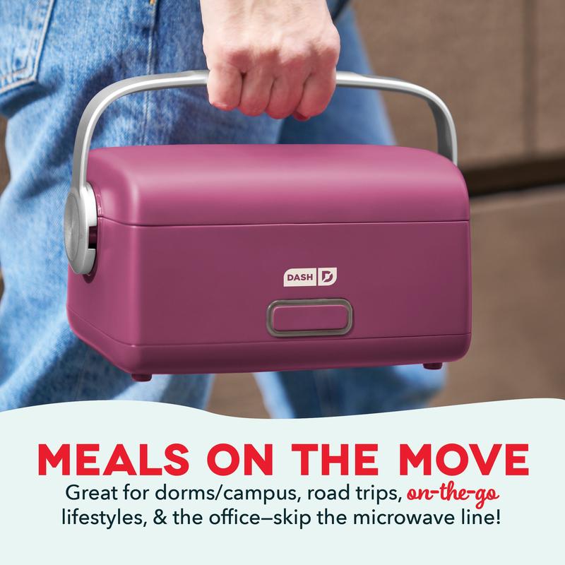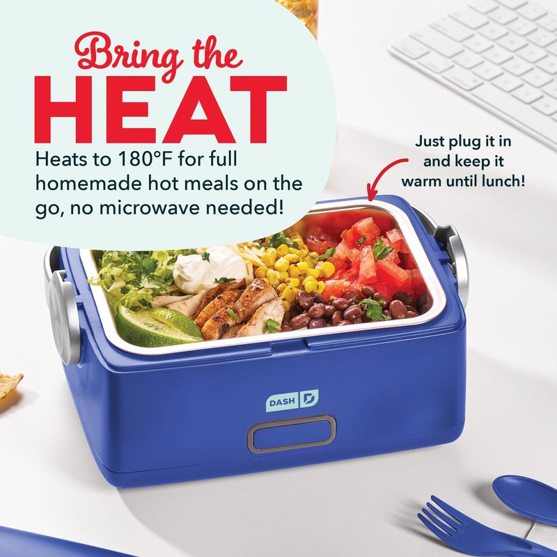 Bring the heat with the Dash Hot2Go™ Electric Lunchbox. Take your favorite meals with you wherever you go, plug in to begin heating, and then it’s ready to eat when you’re hungry! Food is ready to eat about 45 minutes after you plug in, perfect for the office, dorms, or anywhere else you want a homemade hot meal. Skip the cost of take out and the office microwave line and choose your own ingredients for a lunch that’s healthy & homemade, then take what you make! With a 30-ounce capacity, it fits one large soup can, plus it’s great for leftovers, oatmeal, mac & cheese, & more. An easy-carry handle and detachable Power Cord make for maximum portability while the spill-proof Locking Lid keeps everything mess-free while you’re on the go. Also included are a reusable fork and spoon, ensuring you have everything you need to enjoy your meal. Craving some fresh lunch ideas? Check out the included Recipe Guide for easy heating and tasty eating with Hot2Go™!