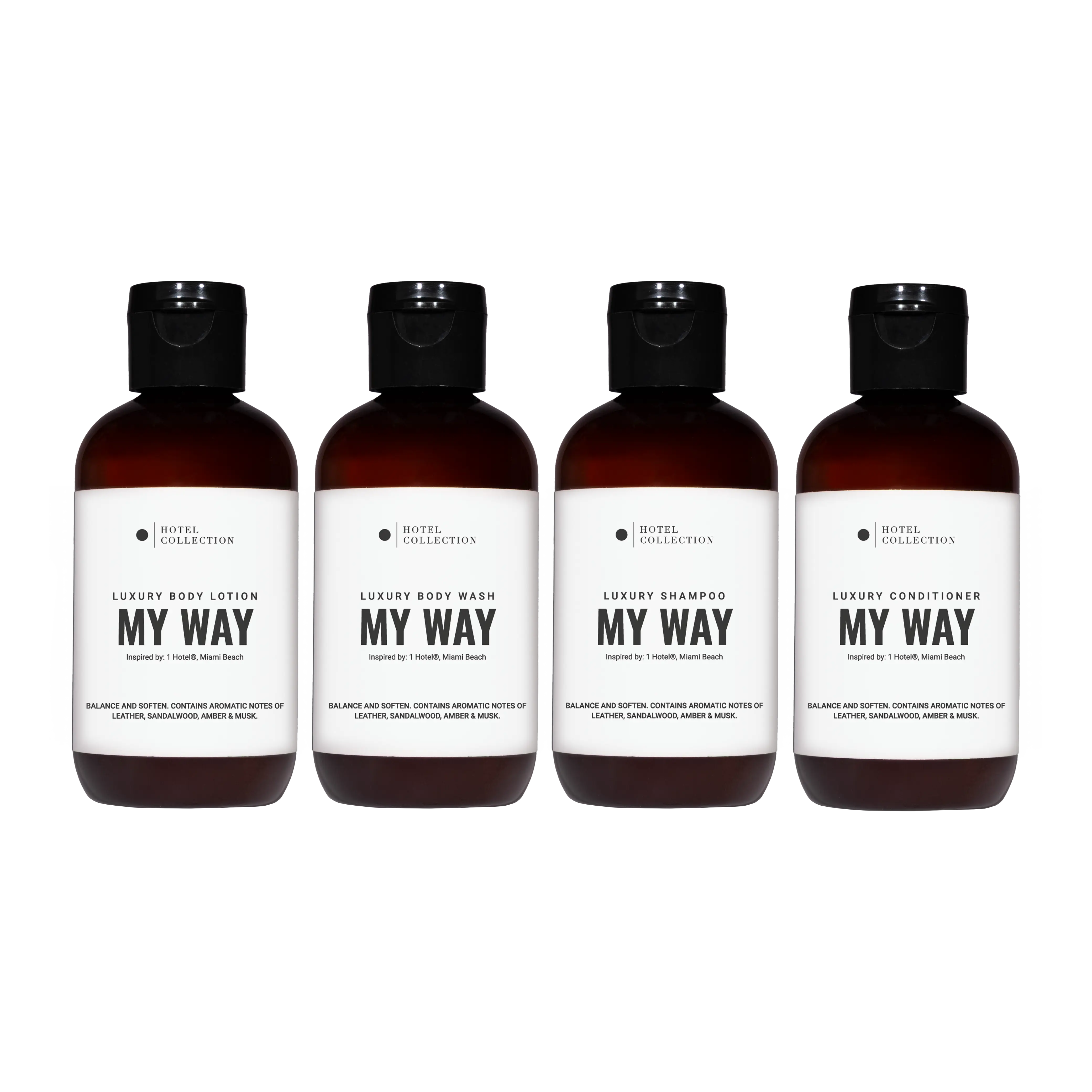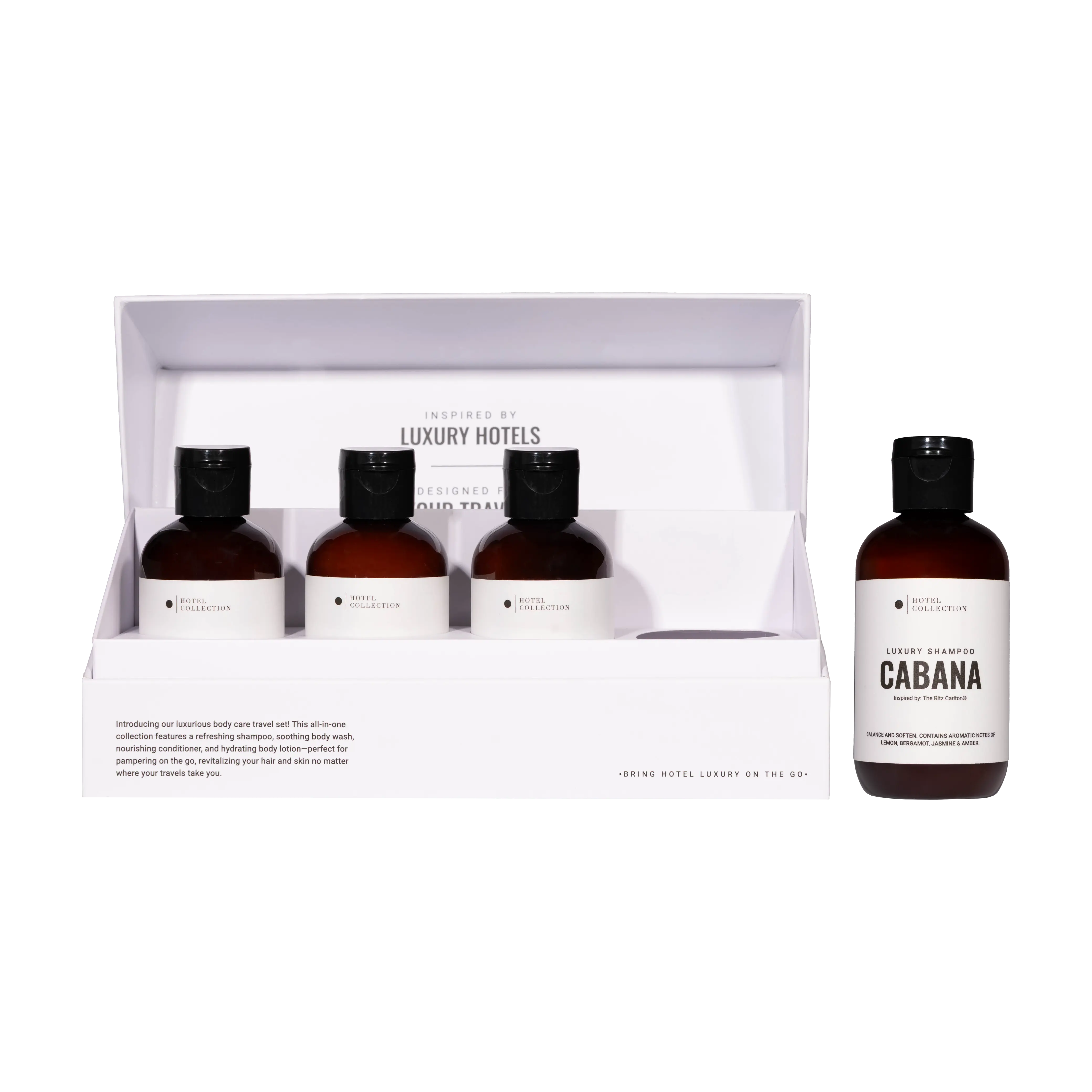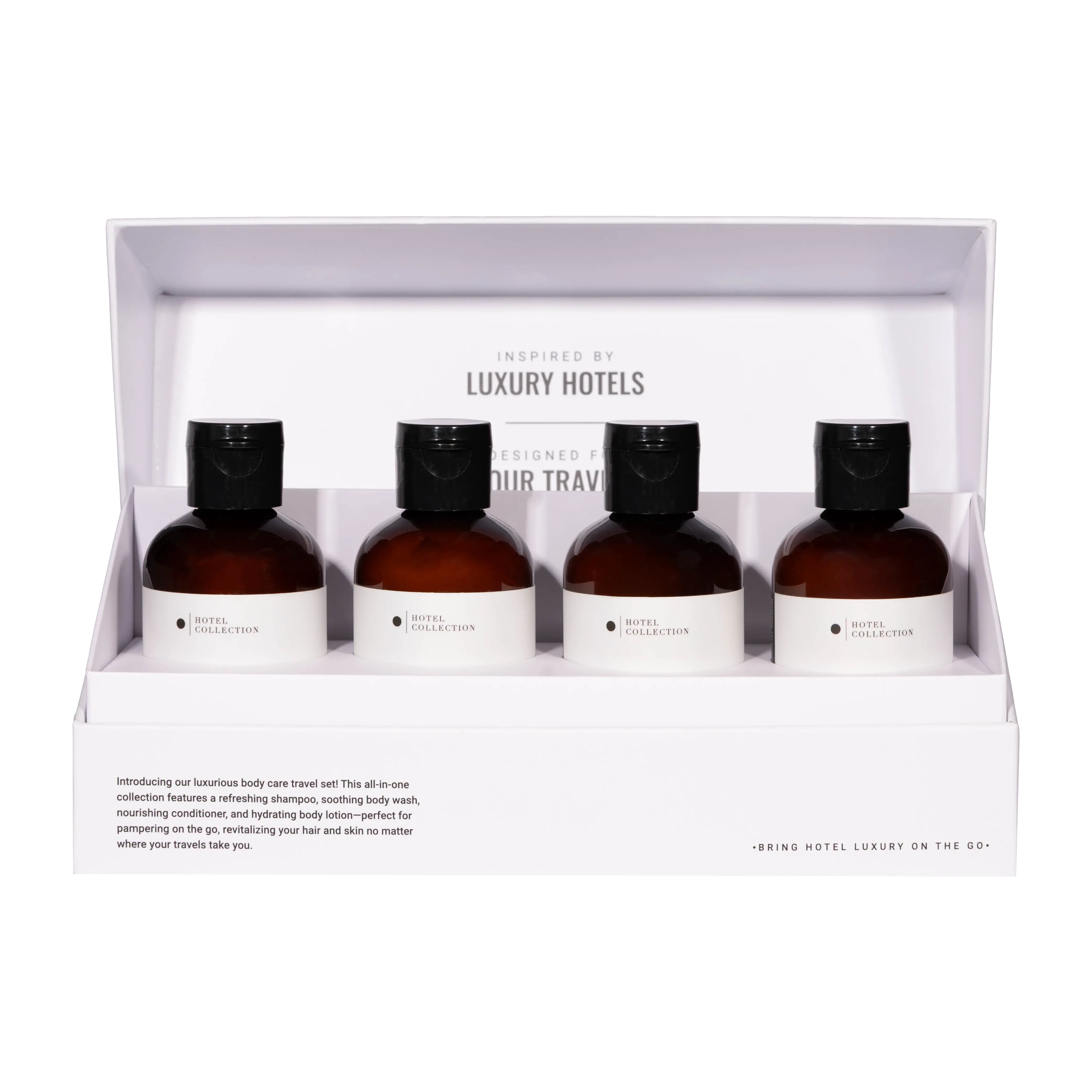 Our Travel Body Care Set includes 100mL bottles of our signature Shampoo, Conditioner, Body Wash, and Lotion, each infused with the same elevated fragrance profile you’d expect from your favorite suite. Perfect for carry-ons, gym bags, or simply upgrading your everyday shower into a staycation.