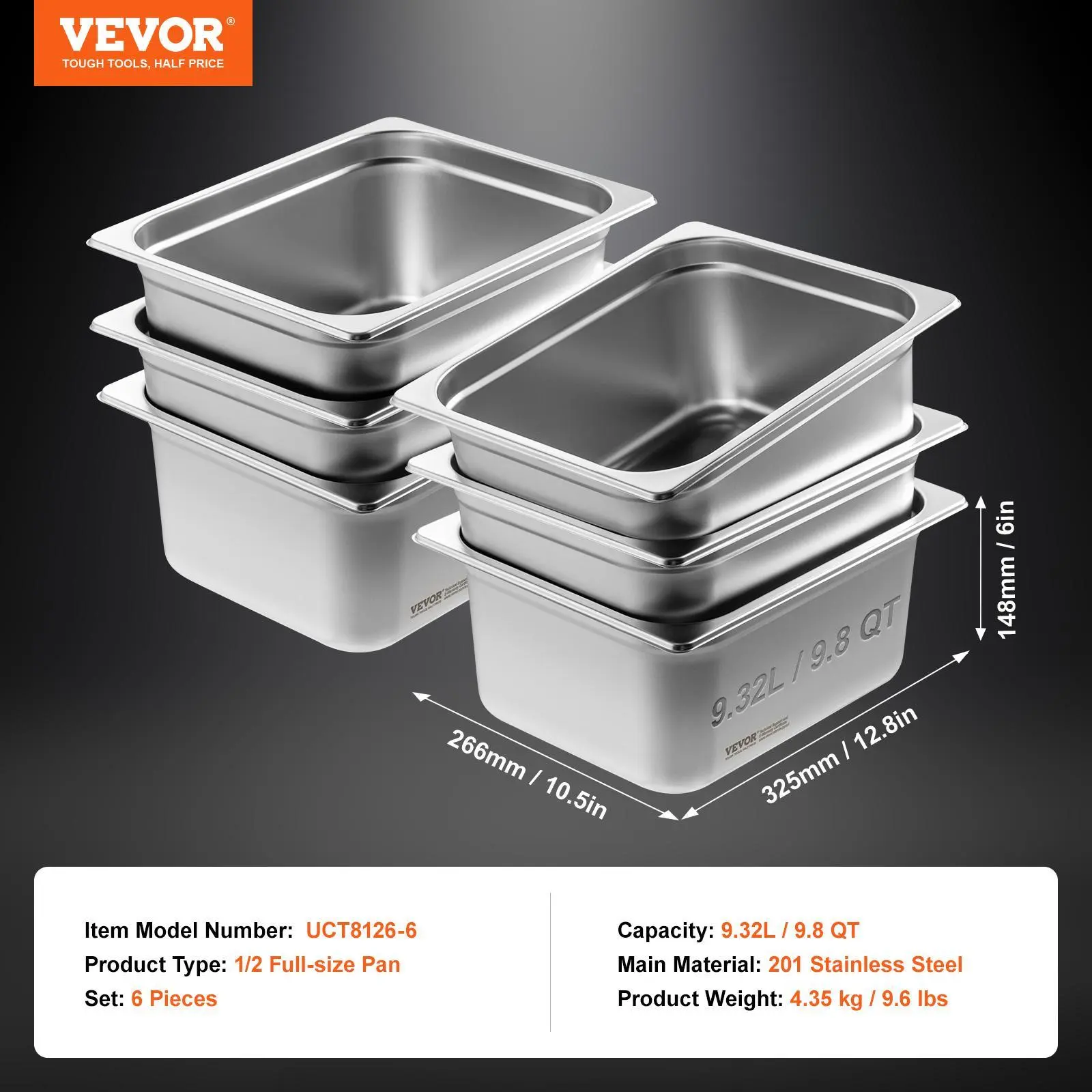 • 1/2-Size Steam Table Pan: 6 pack of 1/2-size steam table pans with lids, made from food-grade SUS201 stainless steel. You can use these pans to hold various meats, vegetables, fruits, ice cream, and any other foods. The lids help protect the food from contamination.