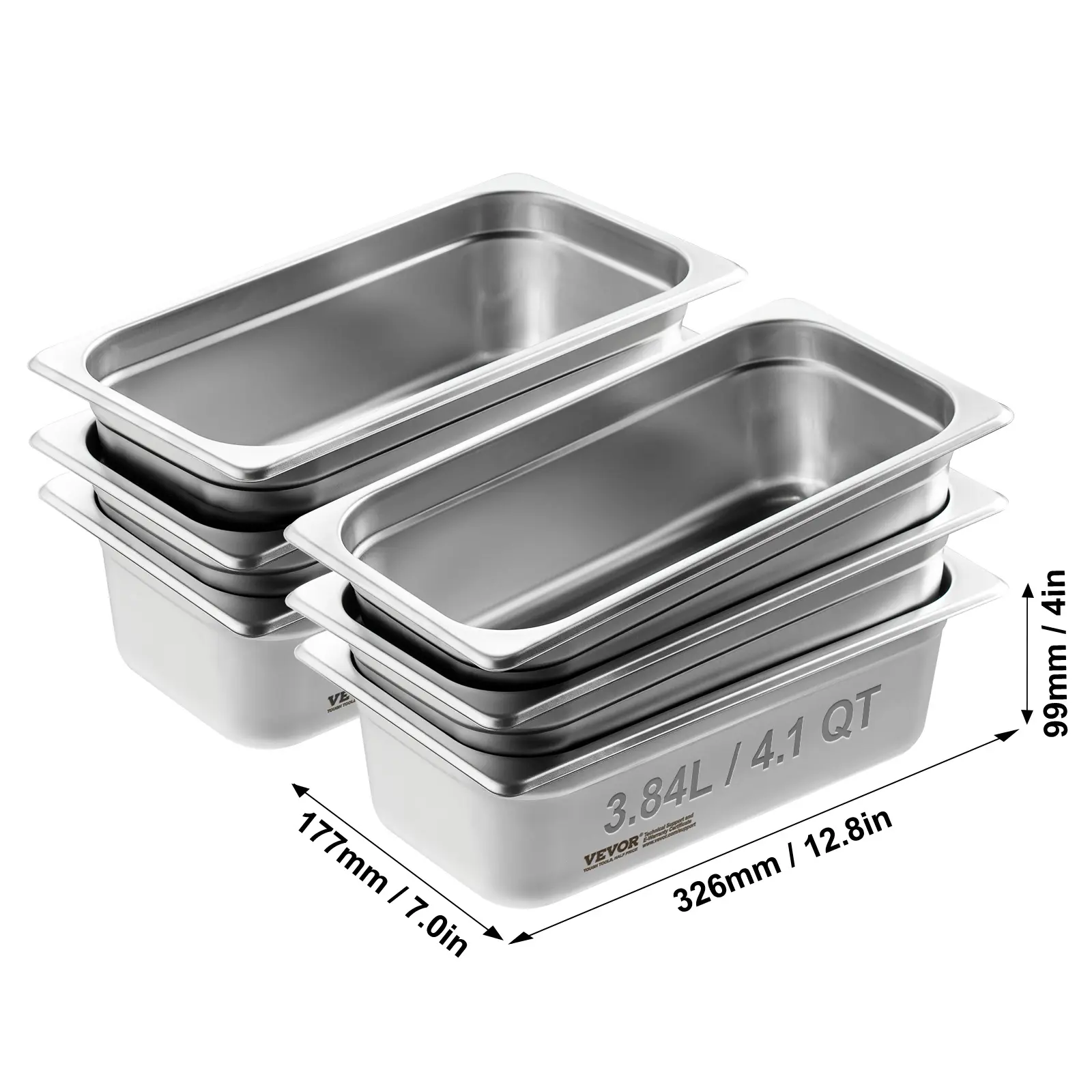 • 1/3-Size Steam Table Pan: 6 pack of 1/3-size steam table pans with lids, made from food-grade SUS201 stainless steel. You can use these pans to hold various meats, vegetables, fruits, ice cream, and any other foods. The lids help protect the food from contamination.