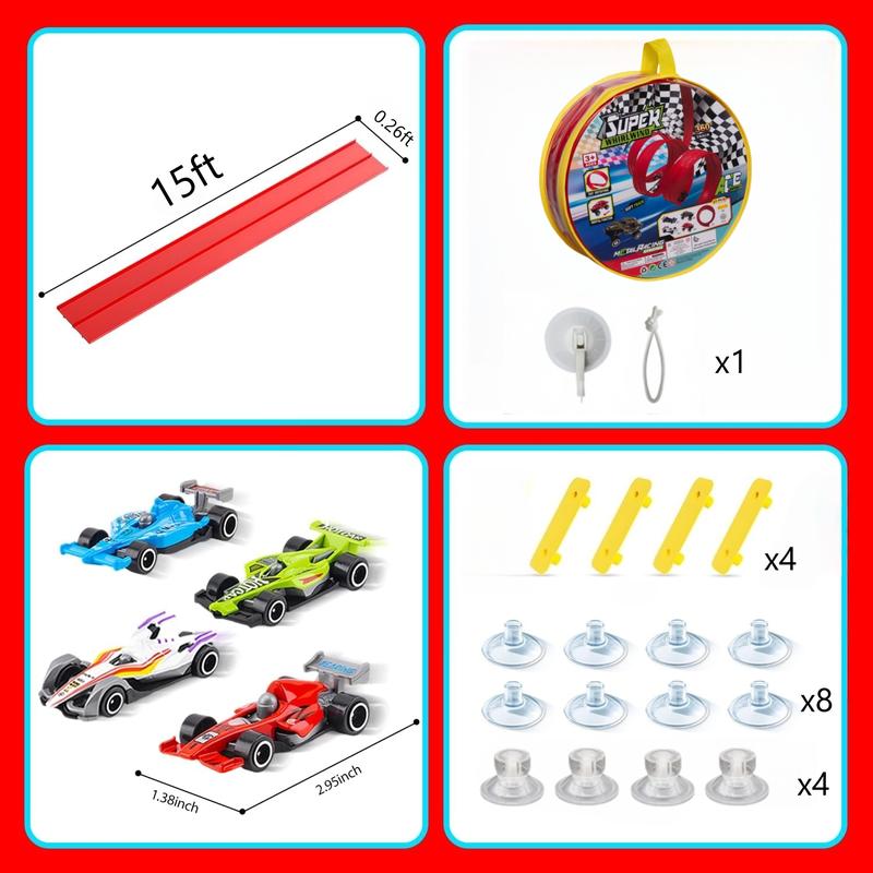 Hotfree 15Ft Flex Tracks Race Car Ramp Set, Slot Car Race Tracks, STEM Flexible Racetrack with 4 Mini Cars, 12 Suction Cups & Hook, Compatible with Hot Wheels & 1:64 Diecast Cars, Portable Roll-Up Track, Birthday & Christmas Gift for Kids Ages 3+ Figures